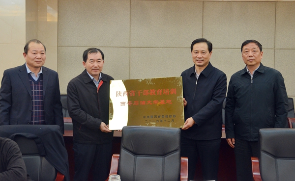 省委組織部干教辦副主任郭文超在會(huì)上宣讀了《關(guān)于同意設(shè)立陜西省干部教育培訓(xùn)西安石油大學(xué)基地的批復(fù)》,王秉琦副部長(zhǎng)、郝利生副書記共同為我校干部教育培訓(xùn)基地授牌。