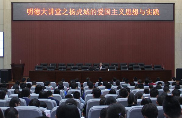 4月7日下午,由校團(tuán)委主辦、化學(xué)化工學(xué)院團(tuán)委承辦的第41期明德大講堂之《楊虎城的愛(ài)國(guó)主義思想與實(shí)踐》在新校區(qū)圖書(shū)館弘石報(bào)告廳舉辦。愛(ài)國(guó)將領(lǐng)楊虎城將軍之孫——楊瀚先生擔(dān)任主講,新校區(qū)四百余名師生參加了講座。