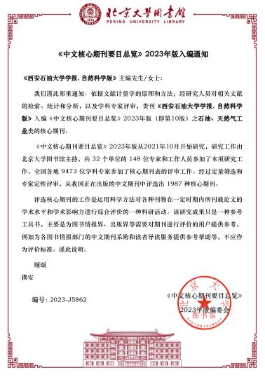 近日,接北京大學(xué)圖書館《中文核心期刊要目總覽》2023年版編委會(huì)通知,《西安石油大學(xué)學(xué)報(bào)(自然科學(xué)版)》入編《中文核心期刊要目總覽》2023年版(即第10版)之石油、天然氣工業(yè)類的核心期刊。這是本刊自2008年以來連續(xù)6次入選全國中文核心期刊。