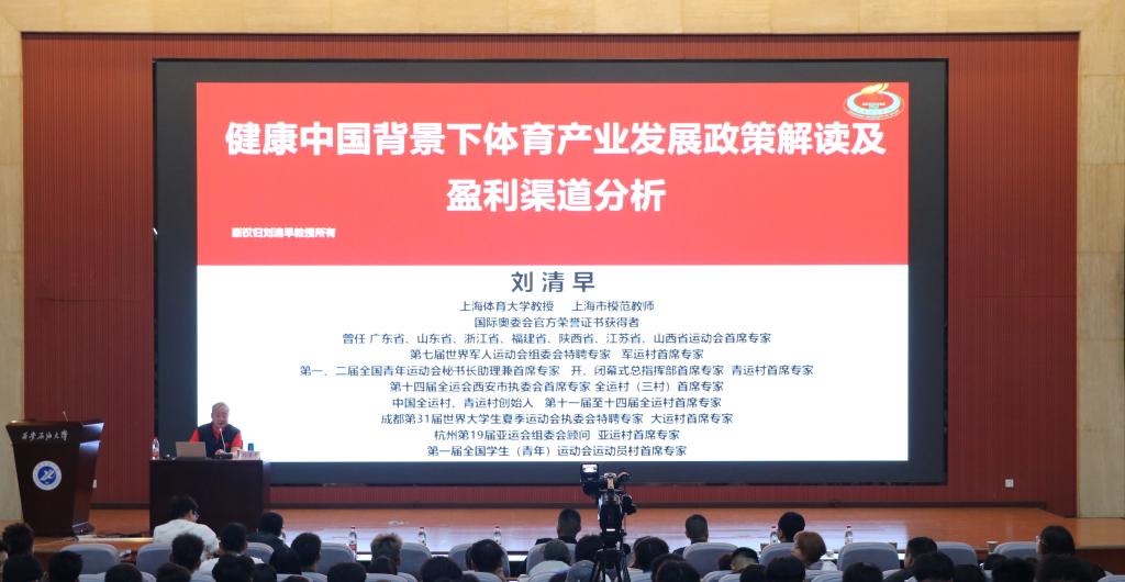 當(dāng)晚,劉清早教授作客“明德大講堂”,在鄠邑校區(qū)圖書館弘石學(xué)術(shù)報(bào)告廳為師生帶來了題為《健康中國背景下體育產(chǎn)業(yè)發(fā)展政策解讀及盈利渠道分析》的專題講座。本次講座由體育學(xué)院和校團(tuán)委主辦,體育學(xué)院黨總支書記茍毅飛,保衛(wèi)(部)處、武裝部副部(處)長袁坤等參加報(bào)告會(huì),學(xué)院專業(yè)教師代表,教學(xué)辦、學(xué)工辦工作人員及全校400余名學(xué)生共同聆聽了講座。報(bào)告會(huì)由體育學(xué)院院長李壽邦主持。