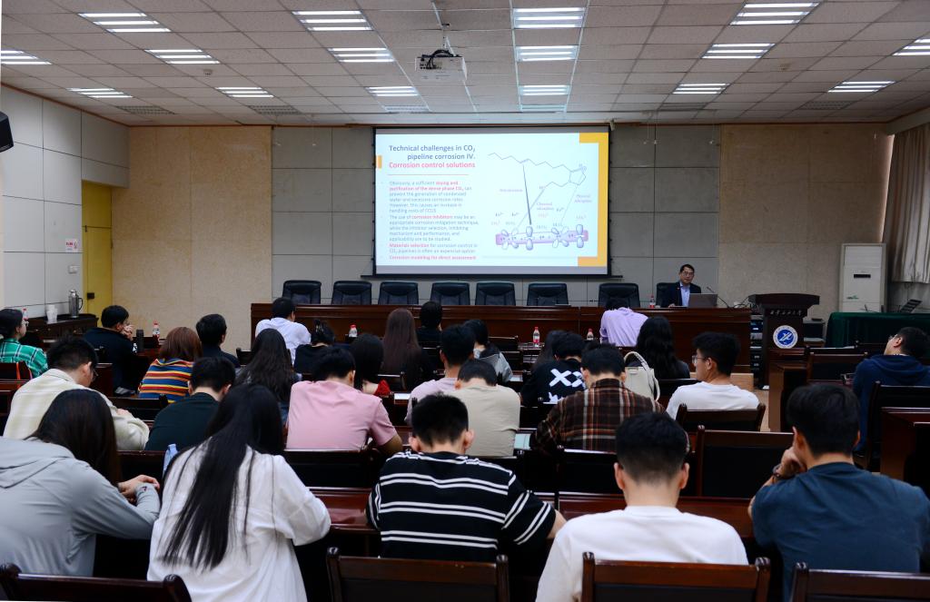 會見前,程玉峰院士在雁塔校區(qū)會議中心第三會議室,為相關專業(yè)師生作了“CCUS技術的二氧化碳管道發(fā)展及內(nèi)腐蝕預測”的學術報告。程院士以“二氧化碳管道的全球分布”為切入點,概述了能源管道技術中的材料創(chuàng)新,包括氫氣脆化研究中的氣態(tài)氫-鐵原子相互作用,輸氫管道技術,CO2管道和儲罐超臨界條件,電化學腐蝕和應力腐蝕開裂(SCC),腐蝕管理中的機器學習方法,管道性能評估、故障和對環(huán)境的影響。他重點講述了CCUS技術、CCUS管道的發(fā)展、CO2管道的設計與技術挑戰(zhàn)及CO2管道的內(nèi)部腐蝕。程院士提出了超臨界CO2腐蝕的新模型及CO2管道的五項技術,包括特定的工作壓力范圍和壓降,以避免不必要的相位變化;由含水量和其他雜質(zhì)引起的腐蝕緩解和監(jiān)測問題;具體的材料考慮,以盡量減少運行裂縫的風險;應急響應計劃和分散建??紤];管道運行期間將采取的安全預防措施。