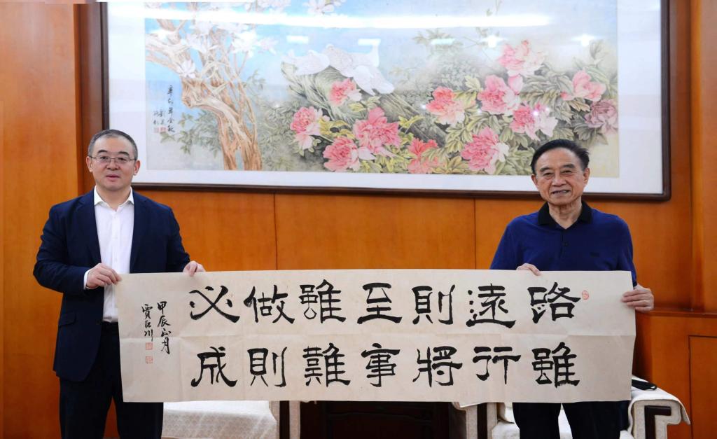 會前,校黨委書記常江、副校長程永清與賈巨川在雁塔校區(qū)會議中心座談。常江為賈巨川教授頒發(fā)紀念品。同時,賈巨川教授也向?qū)W校贈送親筆字卷,以此表達對西安石油大學的至誠祝愿。
