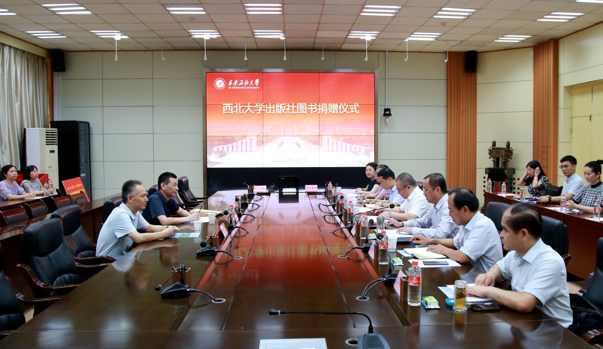 9月3日下午,西北大學(xué)出版社圖書捐贈儀式在我校雁塔校區(qū)會議中心第二會議室舉行。校黨委書記常江,西北大學(xué)出版社總編桂方海出席捐贈儀式。副校長張榮軍主持捐贈儀式并致歡迎詞。西北大學(xué)出版社副總編張運琪代表西北大學(xué)出版社向我校捐贈價值11萬余元碼洋的圖書,包含《史記研究集成》《秦東歷史文化研究》《秦漢研究論叢》等多套精品圖書。