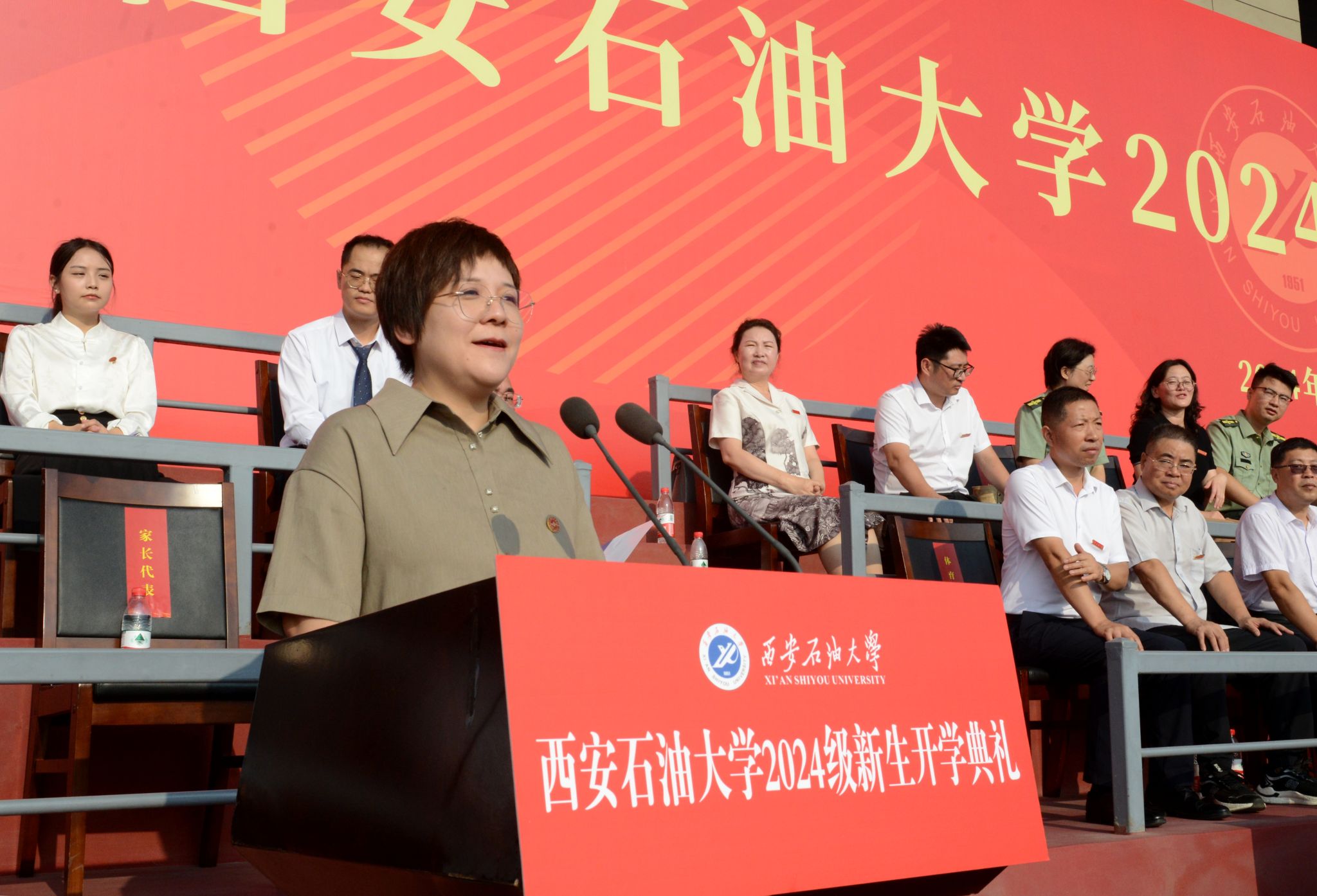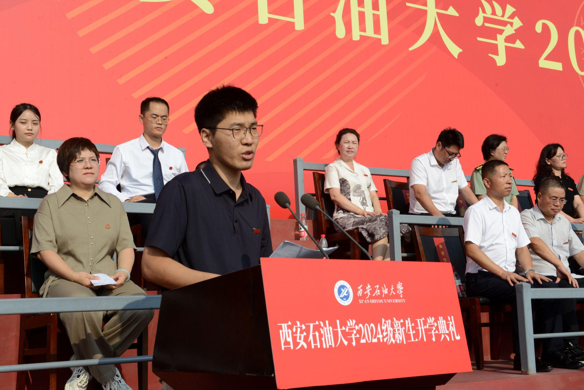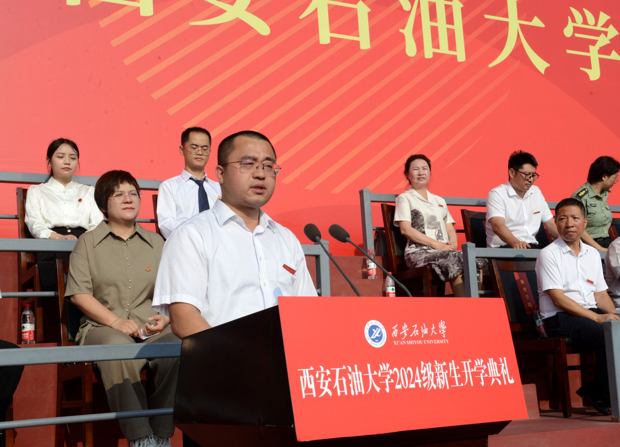 教師代表、石油工程學院院長、陜西省杰出青年基金、陜西省青年科技獎獲得者、陜西省高校青年創(chuàng)新團隊帶頭人黃海教授向2024級新生贈言。他希望同學們要做好角色轉(zhuǎn)換,迎接更高挑戰(zhàn),喚醒心中理想,為之努力拼搏。祝愿同學們在大學里收獲知識,鍛煉能力,積累經(jīng)驗,結交朋友,踏實前行,勇敢追夢,譜寫精彩新篇章。