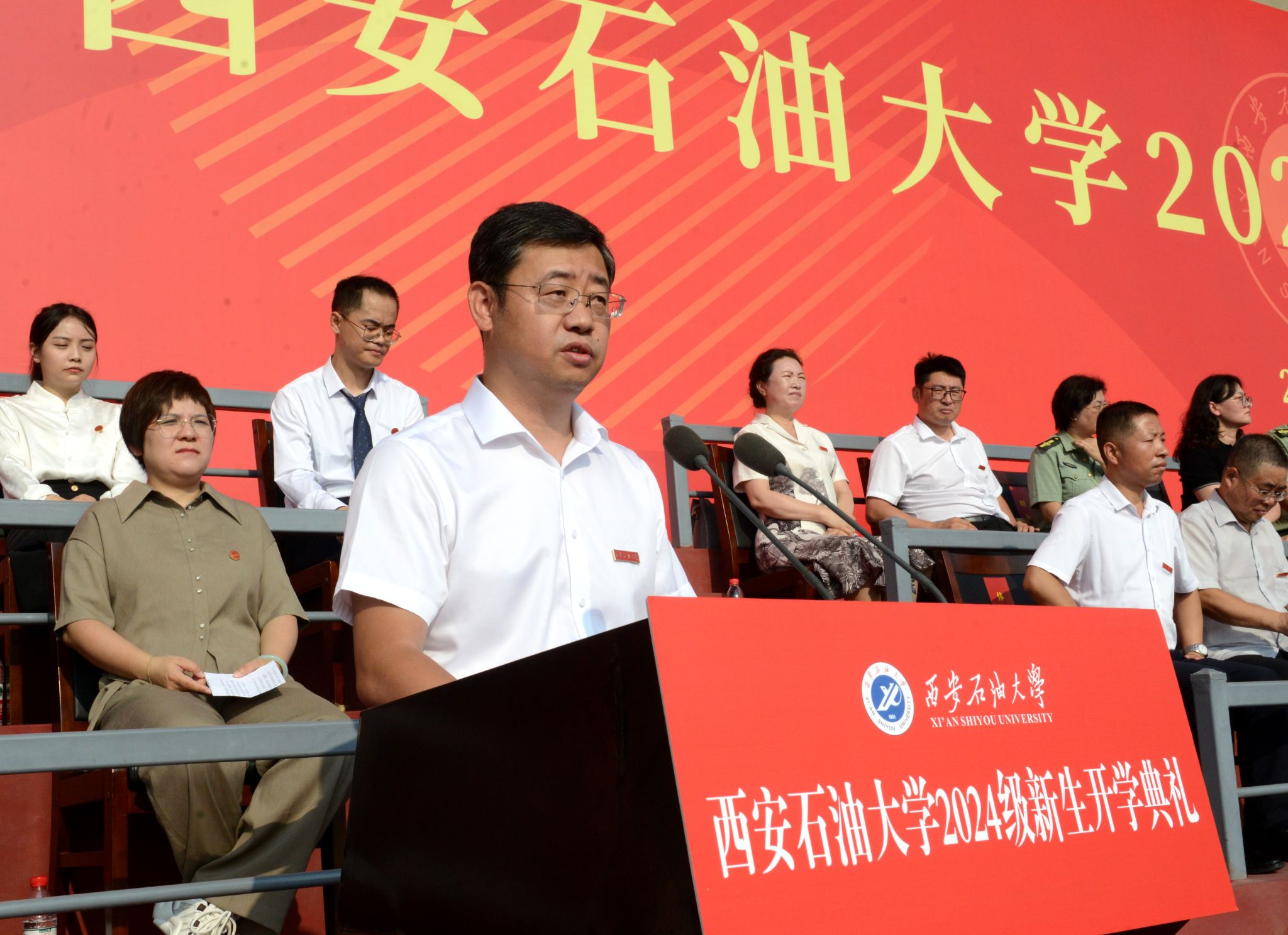 校長王進富以《融合 裂變 重構》為題發(fā)表講話。他代表學校全體師生員工向2024級全體新生表示熱烈歡迎和真摯祝福,對同學們選擇西安石油大學表達衷心感謝。他談到,同學們將和遍布全球的18萬西石大校友、研學校園的2萬5千西石大人一起分享這所大學的歷史榮耀和輝煌成就,共同賡續(xù)這所大學的紅色血脈與光榮使命,并肩傳承這所大學的堅毅精神和發(fā)展責任。