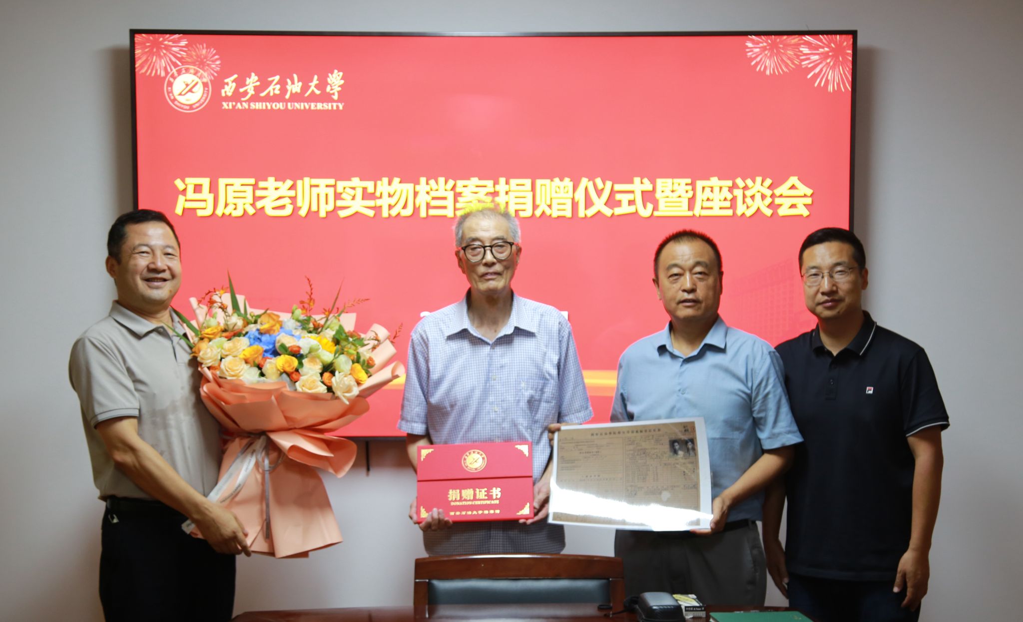 程永清強(qiáng)調(diào),馮老師是學(xué)校的老校友,是我們的老前輩,其懷著對(duì)學(xué)校無(wú)比真摯的感情將一批珍貴實(shí)物檔案捐贈(zèng)給檔案館,我們一定要保護(hù)好、利用好,銘記老一代西石大人對(duì)學(xué)校的貢獻(xiàn)。程永清代表學(xué)校感謝馮老師對(duì)學(xué)校的關(guān)愛(ài)。他表示,老同志們對(duì)學(xué)校的發(fā)展給予厚望,我們一定要接好接力棒,擔(dān)負(fù)起歷史使命,大力傳承紅色血脈,發(fā)揚(yáng)西安石油大學(xué)老一代教師的優(yōu)良品質(zhì),講好西安石油大學(xué)故事,為早日將學(xué)校建成特色鮮明高水平教學(xué)研究型大學(xué)而努力奮斗。