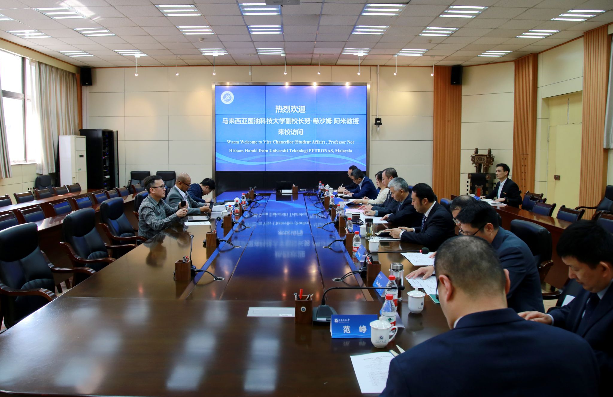 張榮軍首先代表學(xué)校對努·希沙姆·哈米德一行到訪表示熱烈歡迎。他表示,馬來西亞國油科技大學(xué)是我校國際友好學(xué)校與國際合作的重要戰(zhàn)略伙伴之一。近年來雙方交流密切、互動頻繁,成功開展多項(xiàng)合作。在雙方良好合作基礎(chǔ)上,學(xué)校希望深入推進(jìn)兩校高端互訪、教師訪學(xué)、學(xué)生交流、聯(lián)合科研等方向合作,推進(jìn)新合作、結(jié)出新碩果,為中馬教育合作和人文交流繼續(xù)添磚加瓦。