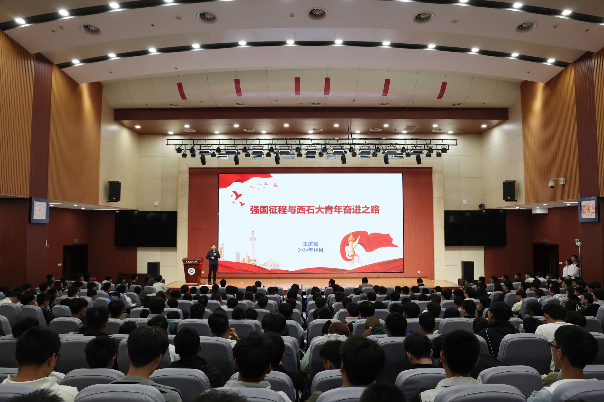 10月23日下午,校長王進富在鄠邑校區(qū)弘石報告廳為地球科學與工程學院師生講授題為“強國征程與西石大青年奮進之路”的專題思政課。地球科學與工程學院負責人、全體學工干部及400余名學生參加。