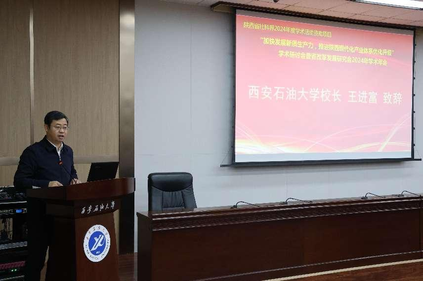 王進(jìn)富在致辭中向與會(huì)的專家學(xué)者表達(dá)了熱烈的歡迎和衷心的感謝,并向長(zhǎng)期以來關(guān)心和支持學(xué)校建設(shè)與發(fā)展的各方人士表示了崇高的敬意。他詳細(xì)介紹了學(xué)校的歷史沿革,指出西安石油大學(xué)是由老一輩革命家創(chuàng)立的,擁有豐富的學(xué)術(shù)傳統(tǒng)和鮮明的學(xué)科特色。在面對(duì)全球快速變化和科技革新的背景下,王進(jìn)富強(qiáng)調(diào)了發(fā)展新生產(chǎn)力的重要性以及教育工作者和科研人員肩負(fù)的責(zé)任。他還分享了學(xué)校在學(xué)科建設(shè)、科研成就以及產(chǎn)學(xué)研合作方面的進(jìn)展,并強(qiáng)調(diào)了對(duì)社會(huì)科學(xué)研究的重視,以及與陜西省改革發(fā)展研究會(huì)的緊密合作關(guān)系。
