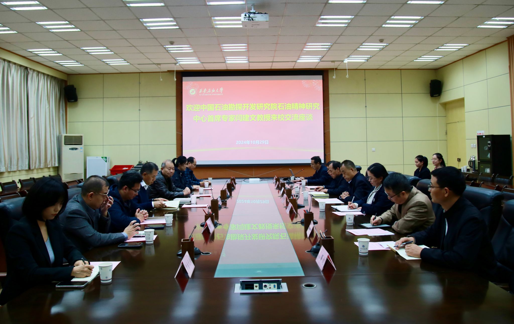 10月29日下午,中國石油勘探開發(fā)研究院石油精神(石油科學家精神)研究中心首席專家閆建文教授來校交流座談。座談會在雁塔校區(qū)第一會議室舉行,校黨委副書記程永清出席會議,黨委宣傳部、教師工作部、人事處、馬克思主義學院、期刊中心、西安石油大學鐵人精神研究中心等單位領導和教師代表、學生代表參加會議。