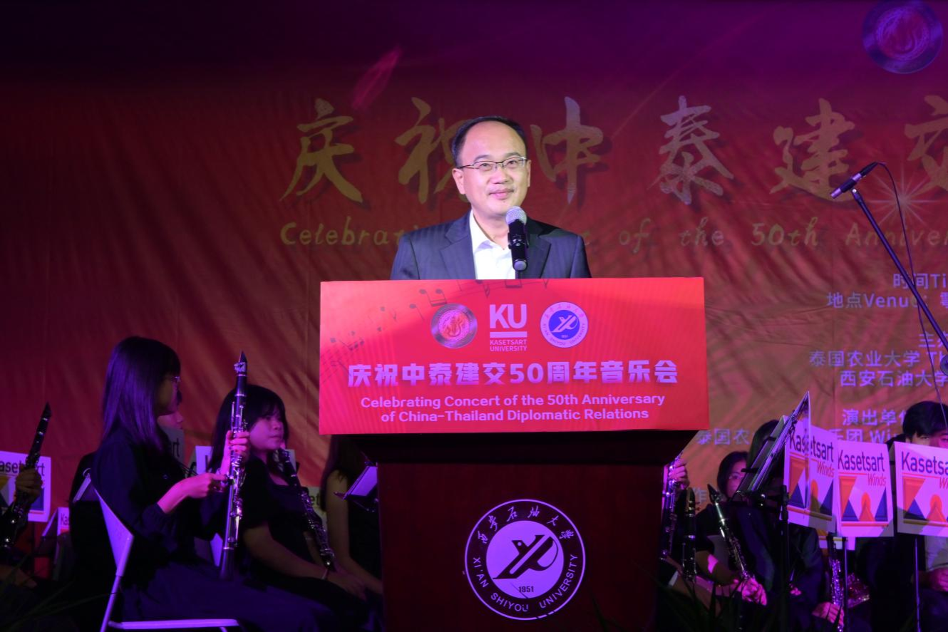 10月29日晚,由泰國(guó)農(nóng)業(yè)大學(xué)、西安石油大學(xué)主辦的高雅藝術(shù)進(jìn)校園—慶祝中泰建交50周年音樂會(huì)在我校鄠邑校區(qū)騰輝大學(xué)生活動(dòng)中心舉辦,泰國(guó)農(nóng)業(yè)大學(xué)副校長(zhǎng)奴察娜塔·蒙功、我校副校長(zhǎng)趙健出席活動(dòng)。學(xué)生工作部、校團(tuán)委、國(guó)際合作與交流處、石油工程學(xué)院、音樂系相關(guān)負(fù)責(zé)人及各院(系)師生代表共計(jì)700余人觀看演出,本次音樂會(huì)由泰國(guó)農(nóng)業(yè)大學(xué)管樂團(tuán)負(fù)責(zé)展演。