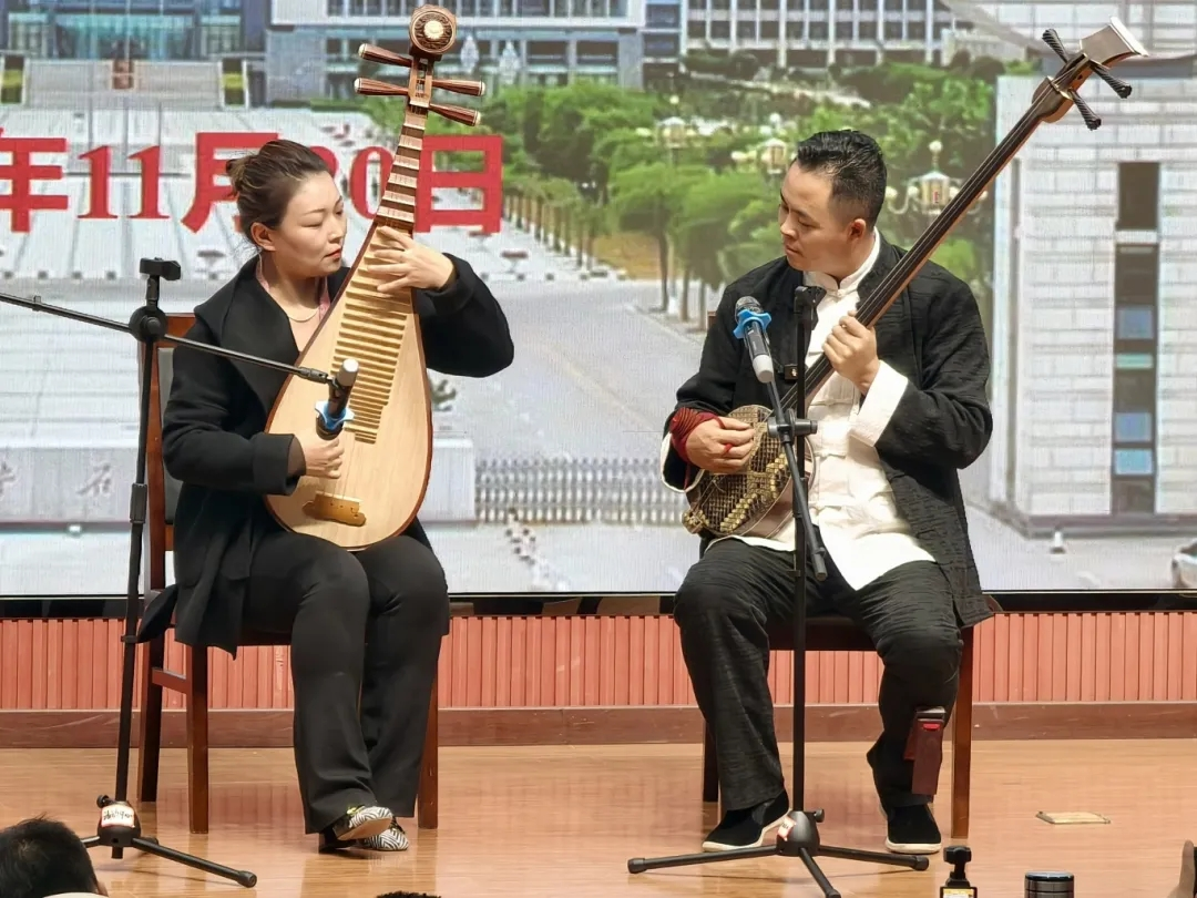 在報告環(huán)節(jié),音樂系副主任張帆作為主講,從陜北說書的起源傳說、藝術(shù)特征、代表書匠、重要節(jié)點(diǎn)、機(jī)遇挑戰(zhàn)等五個方面作了專題背景介紹,并與熊竹英聯(lián)袂演奏了《南泥灣》。
