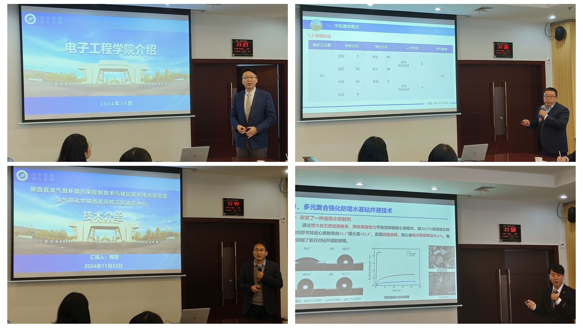 會上,電子工程學院院長李飛、計算機學院院長劉志坤、化學化工學院教授陳剛及石油工程學院博士教師王宗輪就科研團隊及科研成果分別進行了匯報展示。
