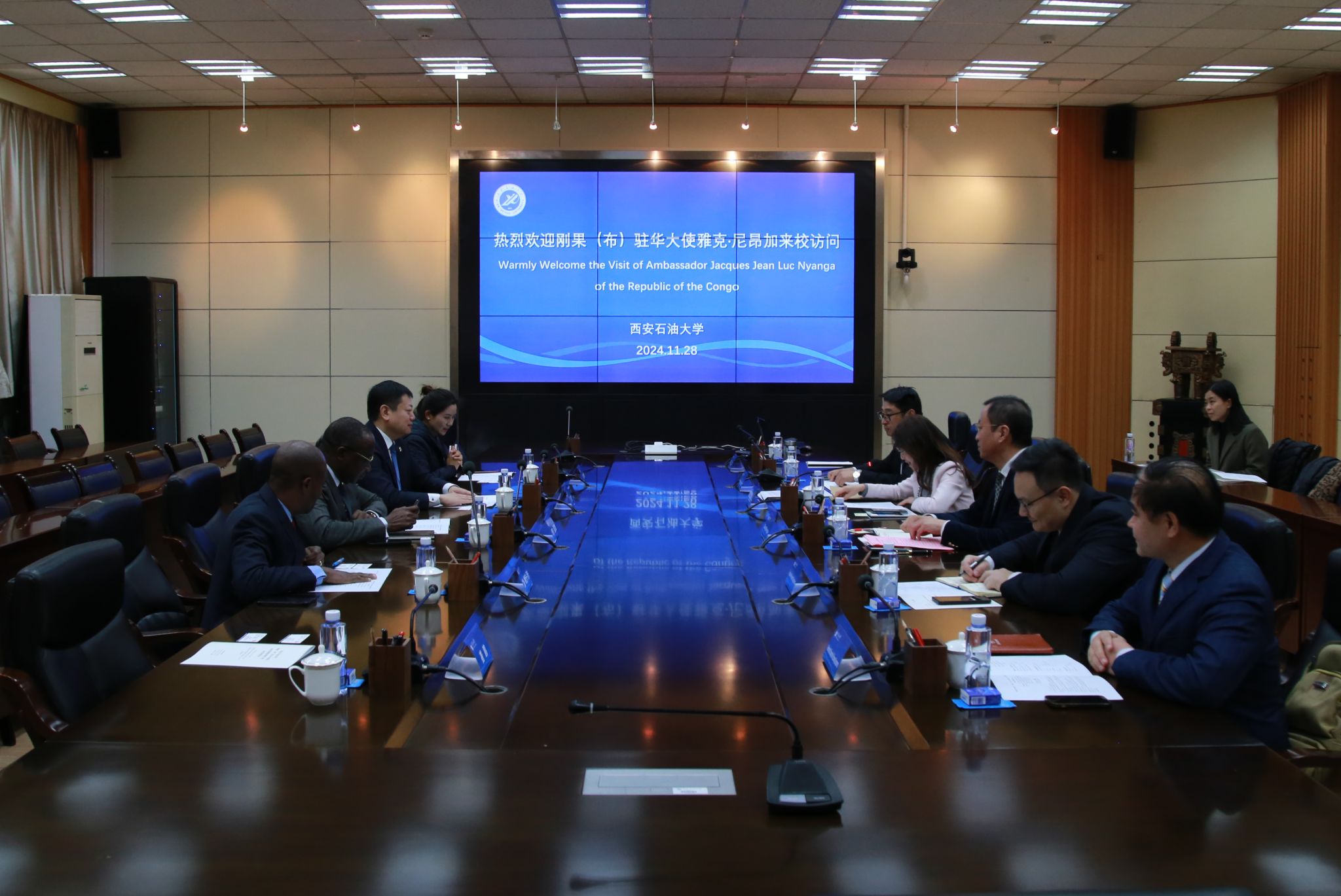 11月28日上午,剛果(布)共和國駐華大使雅克·尼昂加(Jacques Nyanga)、剛果(布)駐華教育參贊艾梅·埃托卡·貝卡(AiméEtoka-beka)及油升聯(lián)國際有限公司總裁邵森、總經(jīng)理助理宋白鶴等一行來校訪問。校長王進(jìn)富會見代表團(tuán)一行,副校長張榮軍出席政校企三方合作座談會,座談會在雁塔校區(qū)會議中心第二會議室召開。