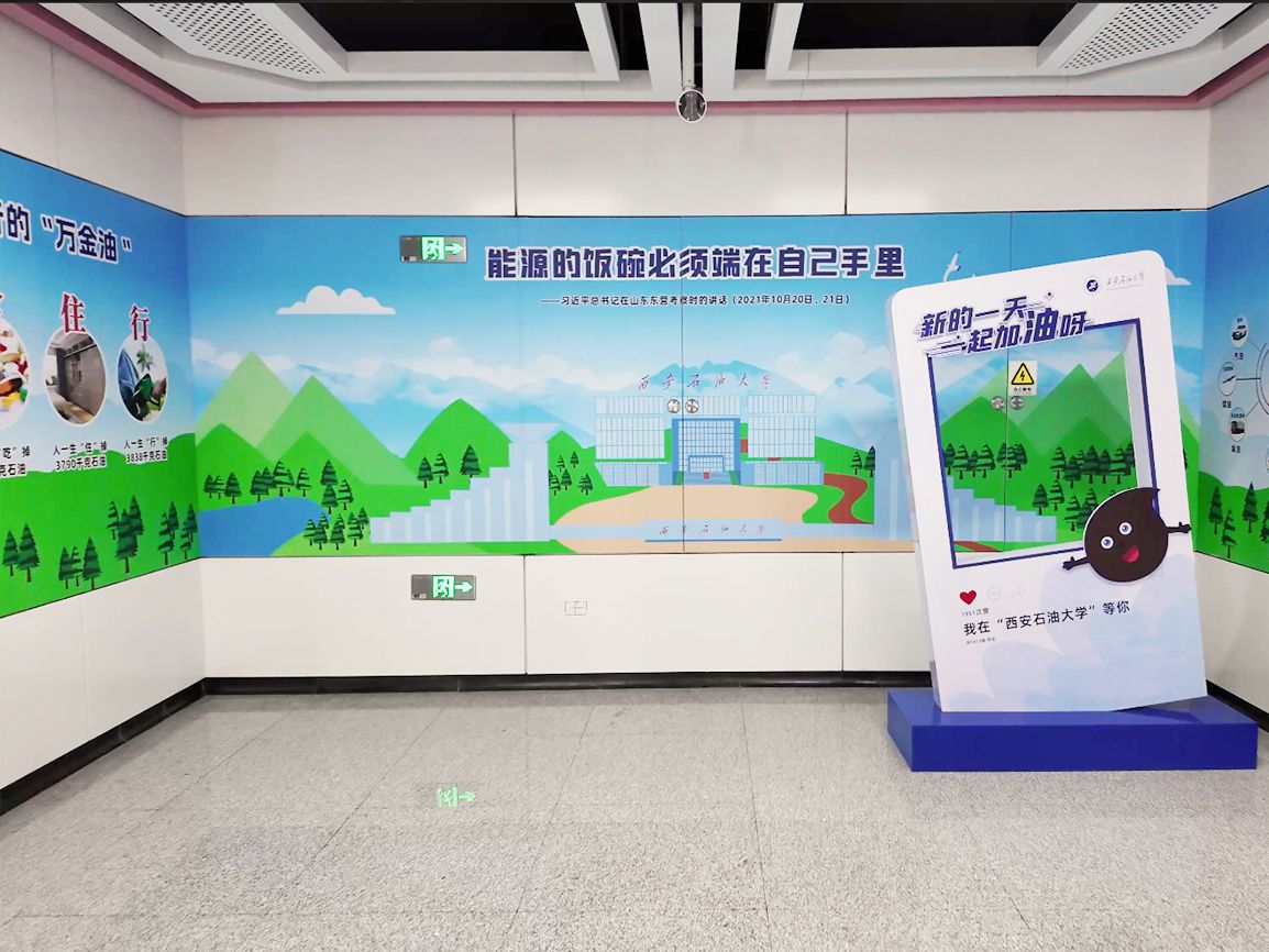 全部布展區(qū)域約102米,以模擬地下開采環(huán)境為背景,結(jié)合進(jìn)出站行進(jìn)路線,規(guī)劃了“七個(gè)場景”的布展內(nèi)容:1號(hào)墻“工業(yè)血液——中國石油工業(yè)的奮進(jìn)篇章”,依托進(jìn)站下行扶梯,再現(xiàn)了石油的最早記錄和中國石油工業(yè)從起步到壯大的輝煌歷程,展示了我國在石油技術(shù)、裝備、合作等領(lǐng)域的新突破;2號(hào)墻“石油七十二變”,依托長廊側(cè)面,展示了石油在生產(chǎn)生活中的具體應(yīng)用場景;3號(hào)墻依托出站時(shí)映入眼簾的正面墻,展示了習(xí)近平總書記關(guān)于國家能源安全的重要論述,同時(shí)融入我校鄠邑校區(qū)經(jīng)典元素剪影(北大門、圖書館、終南山);4號(hào)墻“衣食住行的萬金油”,依托進(jìn)站下樓時(shí)首先映入眼簾的正面墻體,以趣味數(shù)字量化人們?cè)谏钪惺褂玫氖?;?號(hào)墻遠(yuǎn)端,強(qiáng)調(diào)展出了“為祖國加油、為民族爭氣”和“石油精神辦學(xué) 鐵人精神育人 延安精神鑄魂”的理念;5號(hào)墻“西石大智慧”是離出站口最近的必經(jīng)墻體,展示了我校優(yōu)秀科研成果服務(wù)國家重大應(yīng)用場景;6號(hào)墻“油氣產(chǎn)業(yè)鏈全景探索”,依托出站上行扶梯墻體,對(duì)油氣產(chǎn)業(yè)上中下游進(jìn)行了全階段科普展示;最后,利用出站樓梯的側(cè)立面,立體展示了亞洲第一最深直井、我國首口萬米科探井(深地塔科一井)的探地效果和地球的年代地層。