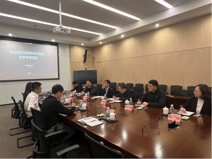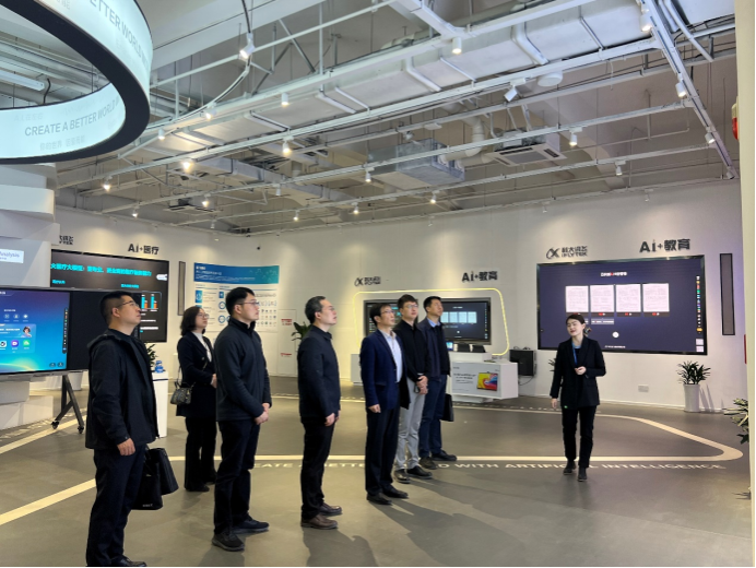 在科大訊飛絲路總部,蘇文甫一行首先參觀了人工智能展廳,深入了解了科大訊飛自創(chuàng)立以來的發(fā)展歷程,包括其在AI+教育、AI+產(chǎn)教融合、AI+聽見、AI+醫(yī)療、AI+城市、AI+智能服務(wù)等多個(gè)領(lǐng)域的產(chǎn)品研發(fā)現(xiàn)狀。隨后,雙方圍繞校企合作模式、人工智能學(xué)科大模型開發(fā)、人才培養(yǎng)及畢業(yè)生就業(yè)渠道等議題展開了深入交流。