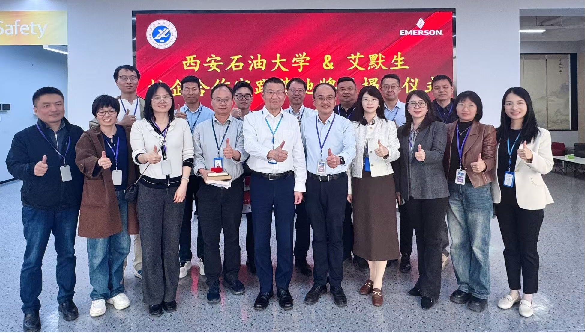 座談結束后,趙健與郭勇移步至成果展示廳,在雙方團隊見證下,共同為西安石油大學&艾默生公司"大學生校外實踐基地"牌匾揭幕。