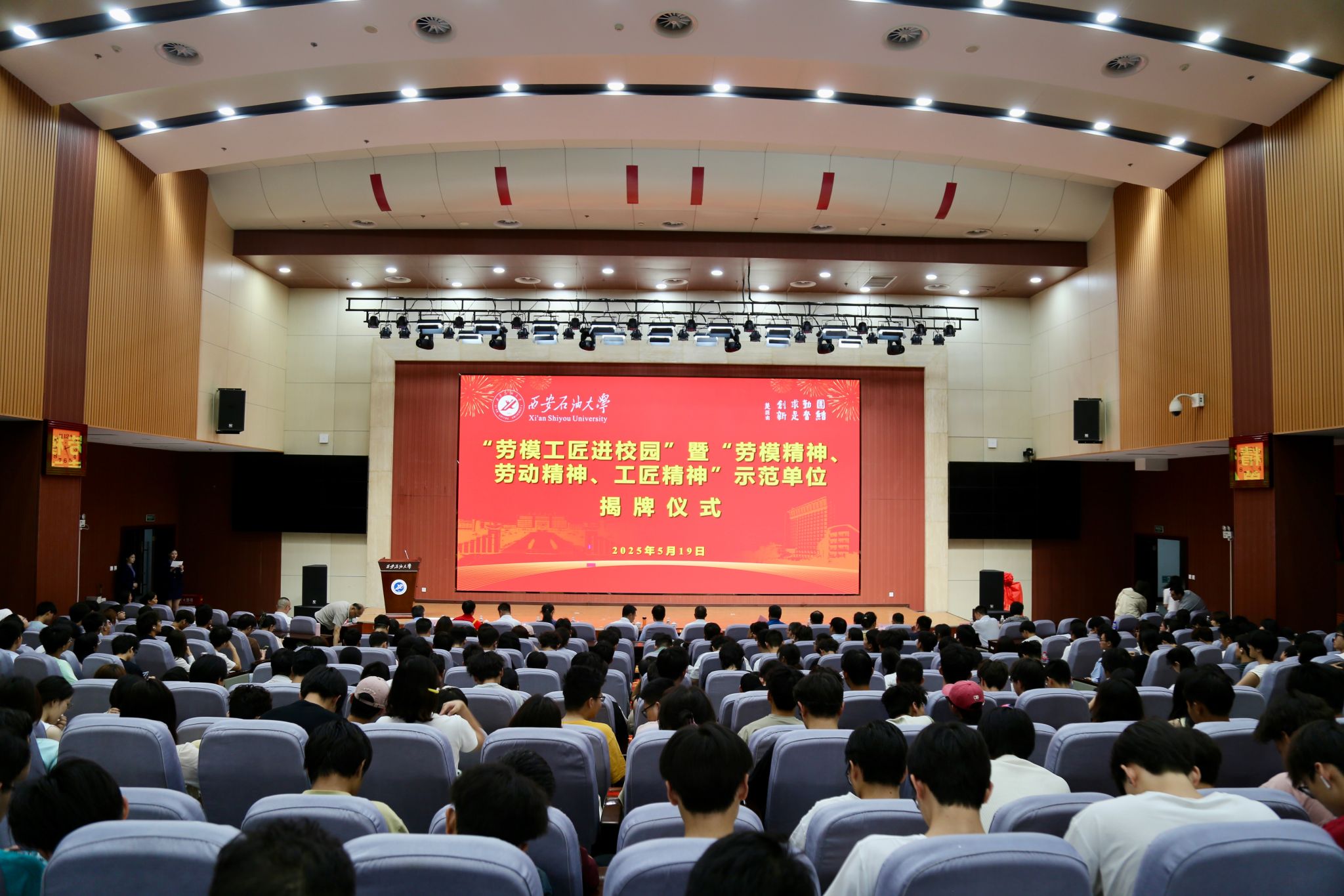 王進富在致辭中對蘭新哲會長和崔完生工會副主席一行的到來表示熱烈歡迎,對我校王進喜紀念館被授予“勞模精神、勞動精神、工匠精神”示范單位感到珍惜和鼓舞。他指出,高校是知識殿堂、人才搖籃,肩負著引領(lǐng)社會進步的重任,弘揚“三種精神”不僅是大學傳承文明的本職,更是服務(wù)國之大者的使命。我校作為一所具有紅色基因的高校,始終將弘揚“三種精神”作為落實立德樹人根本任務(wù)的重要抓手,融入辦學血脈,畢業(yè)生中涌現(xiàn)出一批杰出典型。希望同學們要以“三種精神”為坐標,立精神之柱,擔時代之責,為助力陜西新時代追趕超越和能源強國建設(shè)貢獻智慧與力量。