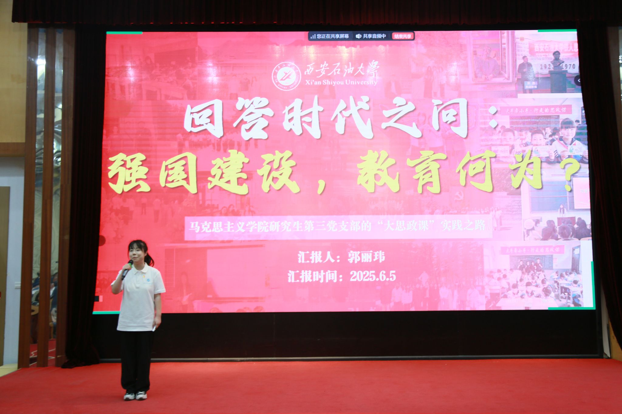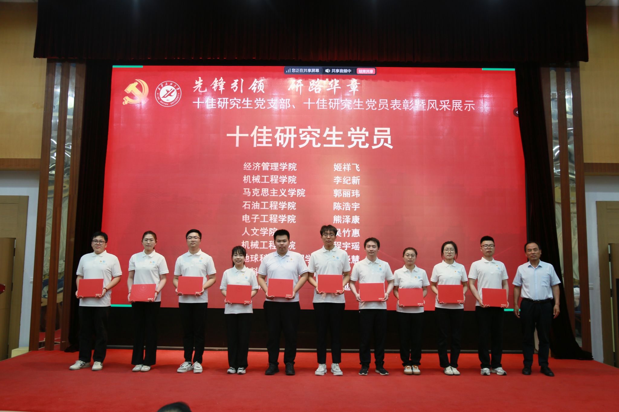 為充分發(fā)揮先進(jìn)典型的示范引領(lǐng)作用,激發(fā)研究生基層黨組織活力與黨員使命擔(dān)當(dāng),6月5日下午,西安石油大學(xué)首屆“十佳研究生黨支部”“十佳研究生黨員”表彰暨風(fēng)采展示會(huì)在雁塔校區(qū)會(huì)議中心學(xué)術(shù)報(bào)告廳隆重舉行。校黨委委員、副校長種宇宏出席活動(dòng)。黨委辦公室、紀(jì)檢監(jiān)察機(jī)構(gòu)、黨委組織部、黨委宣傳部、機(jī)關(guān)黨委、校團(tuán)委、研究生院、研究生工作部等部門負(fù)責(zé)人,各學(xué)院黨委書記、研究生主管領(lǐng)導(dǎo)、研究生輔導(dǎo)員及研究生黨員代表共300余人參加。