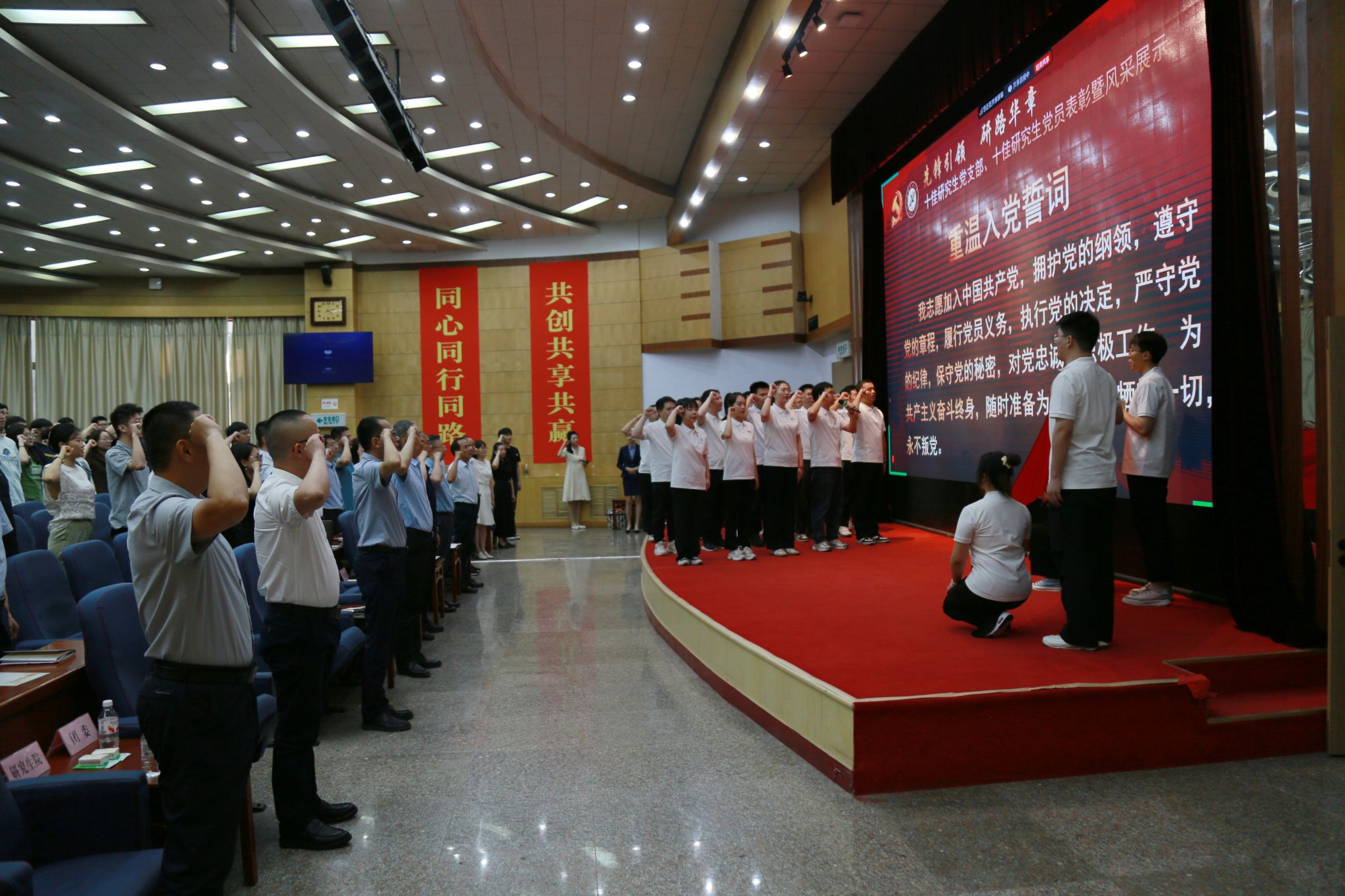 展示結(jié)束后,現(xiàn)場全體黨員在“雙十佳”研究生黨員的帶領(lǐng)下重溫入黨誓詞。大家舉起右拳,莊嚴(yán)宣誓,再一次用入黨誓詞洗滌心靈,激發(fā)為共產(chǎn)主義奮斗終生的昂揚(yáng)精神。