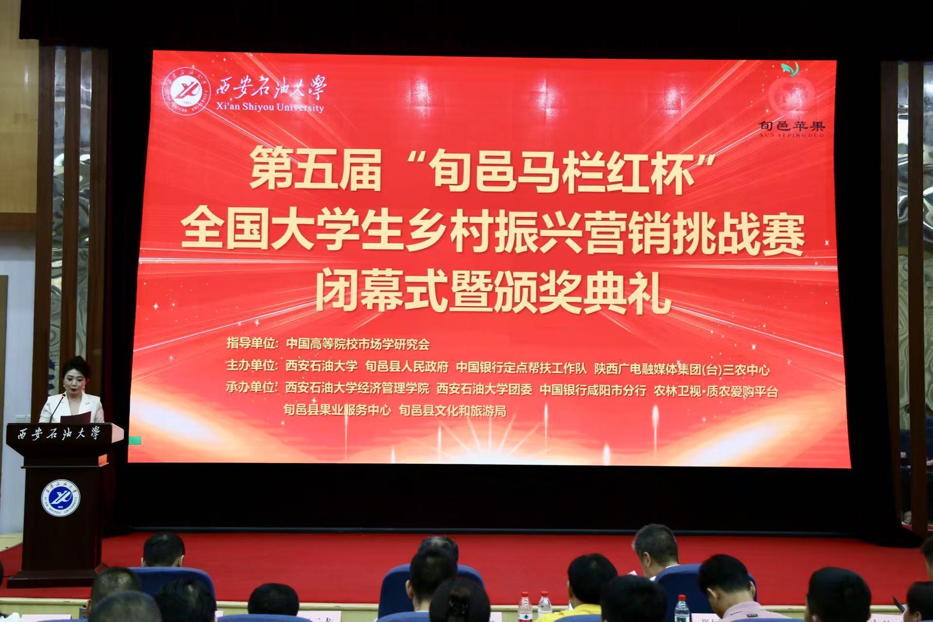 7月3日,第五屆“旬邑馬欄紅杯”全國大學生鄉(xiāng)村振興營銷挑戰(zhàn)賽閉幕式暨頒獎典禮在西安石油大學雁塔校區(qū)會議中心順利舉行。本屆賽事由西安石油大學、旬邑縣人民政府、陜西廣電融媒體集團三農(nóng)中心等單位共同主辦,中國高等院校市場學研究會為指導單位。咸陽市副市長葉新階、副秘書長何有明、農(nóng)業(yè)農(nóng)村局副局長袁野,陜西省果業(yè)中心綜合處處長張東峰,旬邑縣委副書記、縣長陳永勝、副縣長譚震,陜西廣電融媒體集團質(zhì)農(nóng)愛購平臺總經(jīng)理趙小飛,中國銀行咸陽分行行政事業(yè)部主任朱燕萍、陜西日報群眾新聞網(wǎng)副總經(jīng)理劉強,西安石油大學黨委副書記張木等出席閉幕式。參賽團隊、企業(yè)負責人百余人到場參會。