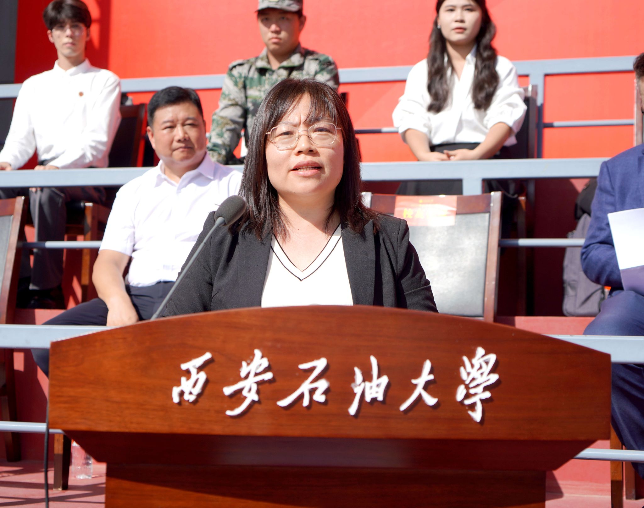 校長王進(jìn)富以《破繭蛻變成蝶》為題發(fā)表講話。他代表學(xué)校全體師生員工向6710名新生啟航新征途表示熱烈歡迎和真摯祝福,勉勵(lì)同學(xué)們叩問初心,思考為何而來、去向何方。他結(jié)合暑假期間行程16400公里、跨越祖國能源版圖的經(jīng)緯,走訪30多家企業(yè)、200多名在石油企業(yè)一線躍動(dòng)的西石大校友的經(jīng)歷,與同學(xué)們分享大學(xué)的三個(gè)成長箴言:錨定人生坐標(biāo)、實(shí)現(xiàn)認(rèn)知躍遷、賦能民族復(fù)興。