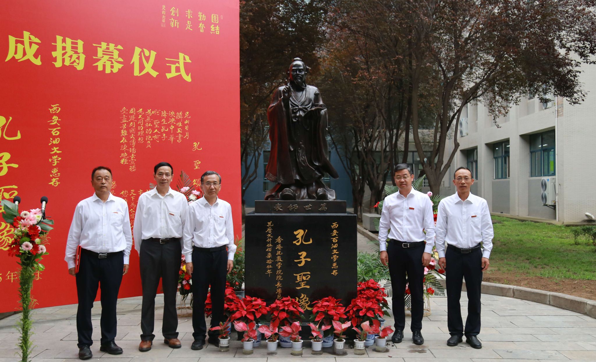 在全體與會(huì)人員的共同見(jiàn)證下,王進(jìn)富、張木、張君濤、周德勝共同為孔子銅像揭幕。全體領(lǐng)導(dǎo)、師生代表向孔子銅像行鞠躬禮。