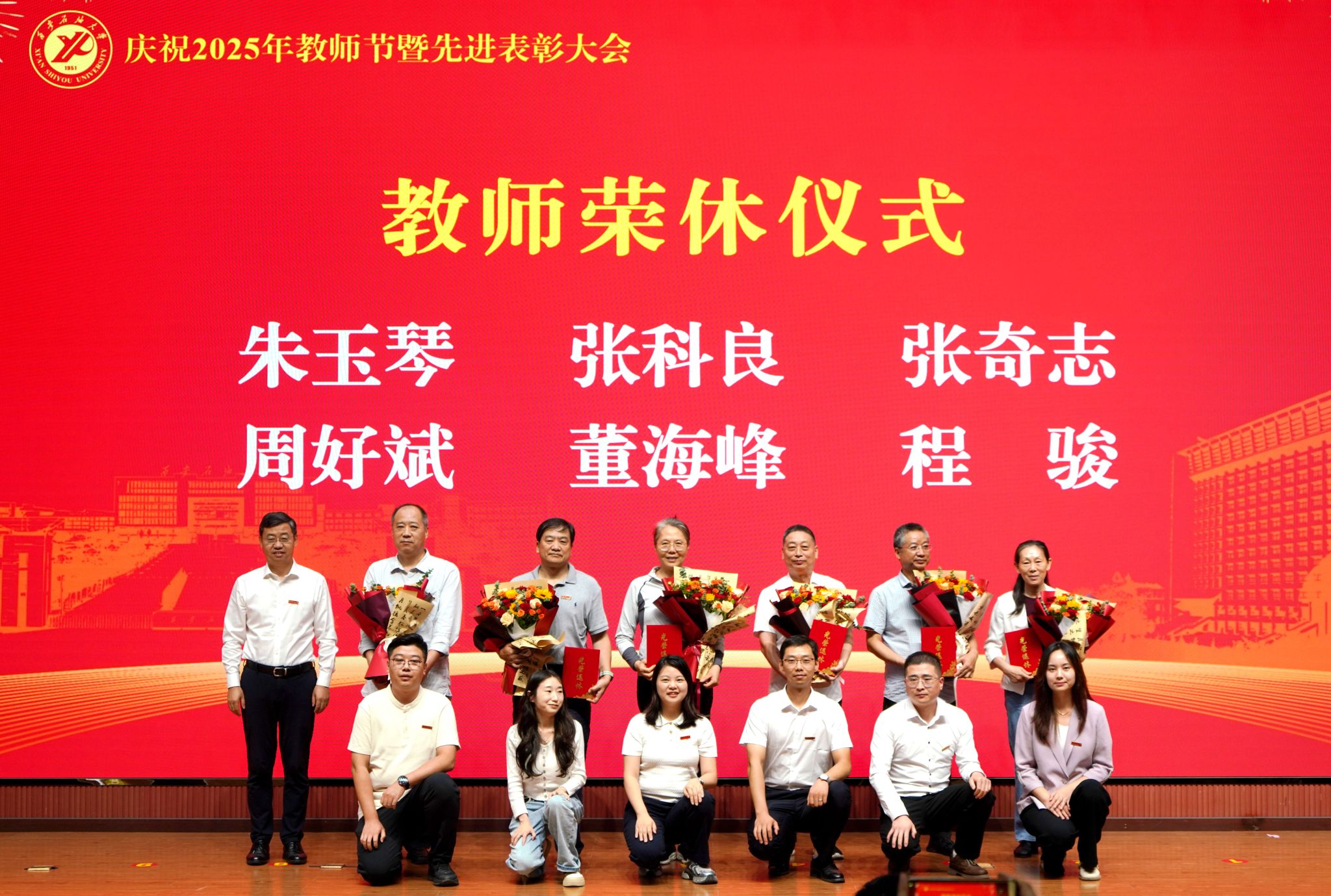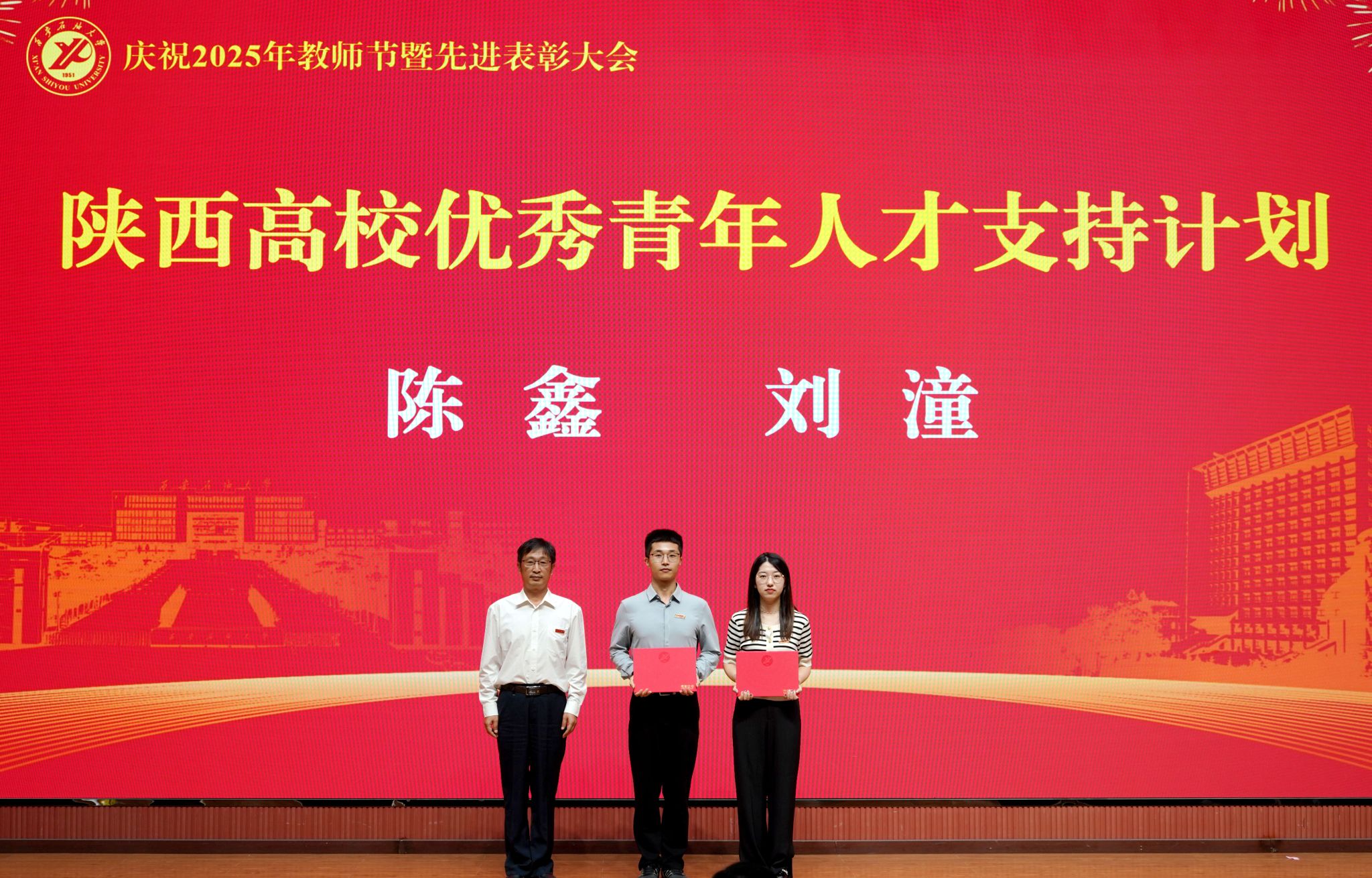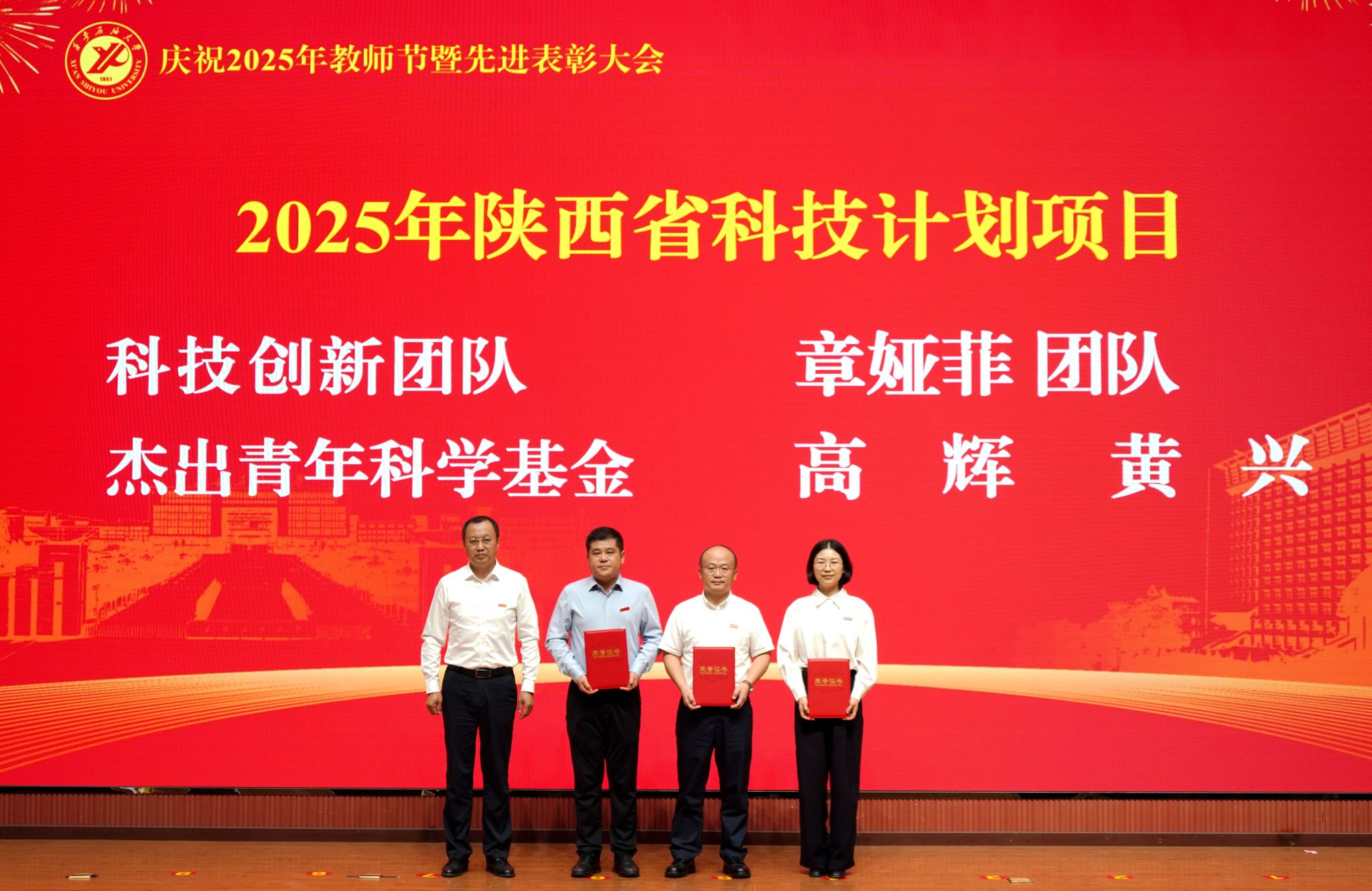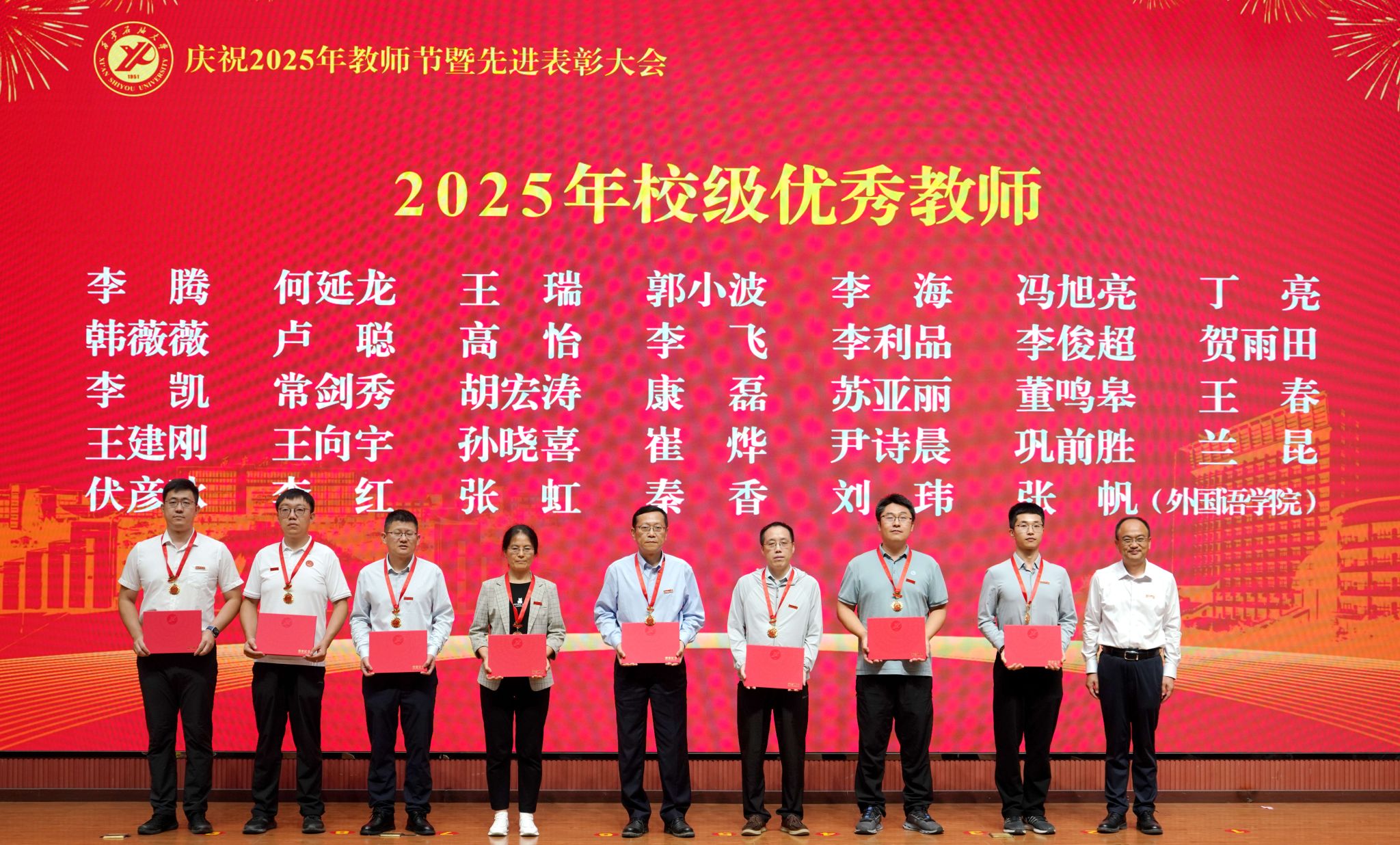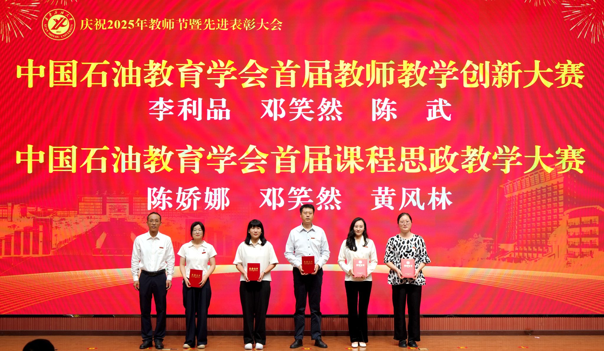 表彰大會在國歌聲中開始,校領導宣讀表彰決定,并為受表彰教師代表頒發(fā)證書和獎章。校黨委副書記張木宣讀2024年度陜西省科學技術進步獎、國家重大人才工程和國家青年人才工程入選名單;校黨委副書記、紀委書記、監(jiān)察專員王輝強宣讀陜西省高層次人才特殊支持計劃等人選名單;副校長蘇文甫宣讀陜西高校優(yōu)秀青年人才支持計劃、陜西省“三秦博創(chuàng)”人才支持項目、中國石油和化工自動化行業(yè)科學技術獎獲獎名單;副校長張榮軍宣讀2025年陜西省科技計劃項目(第三批、第四批)、陜西省2023年高等教育教學成果獎和陜西省第十三屆基礎教育教學成果獎獲獎名單;副校長張君濤宣讀陜西省課程思政精品課程,中國石油教育學會2024年石油高等教育教學成果獎、首屆教師教學創(chuàng)新大賽、首屆課程思政教學大賽獲獎名單;副校長張驍勇宣讀《中共西安石油大學委員會關于表彰2025年師德先進集體和先進個人的決定》;副校長趙健宣讀《西安石油大學關于表彰獎勵“教書育人30年”教師的決定》《中共西安石油大學委員會 西安石油大學關于表彰2025年優(yōu)秀教師、先進教育工作者的決定》;副校長種宇宏宣讀第21屆陜西青年五四獎章和第二屆全國大學生職業(yè)規(guī)劃大賽陜西省決賽獲獎名單,全體與會校領導為受表彰教師代表頒發(fā)證書和獎章。
