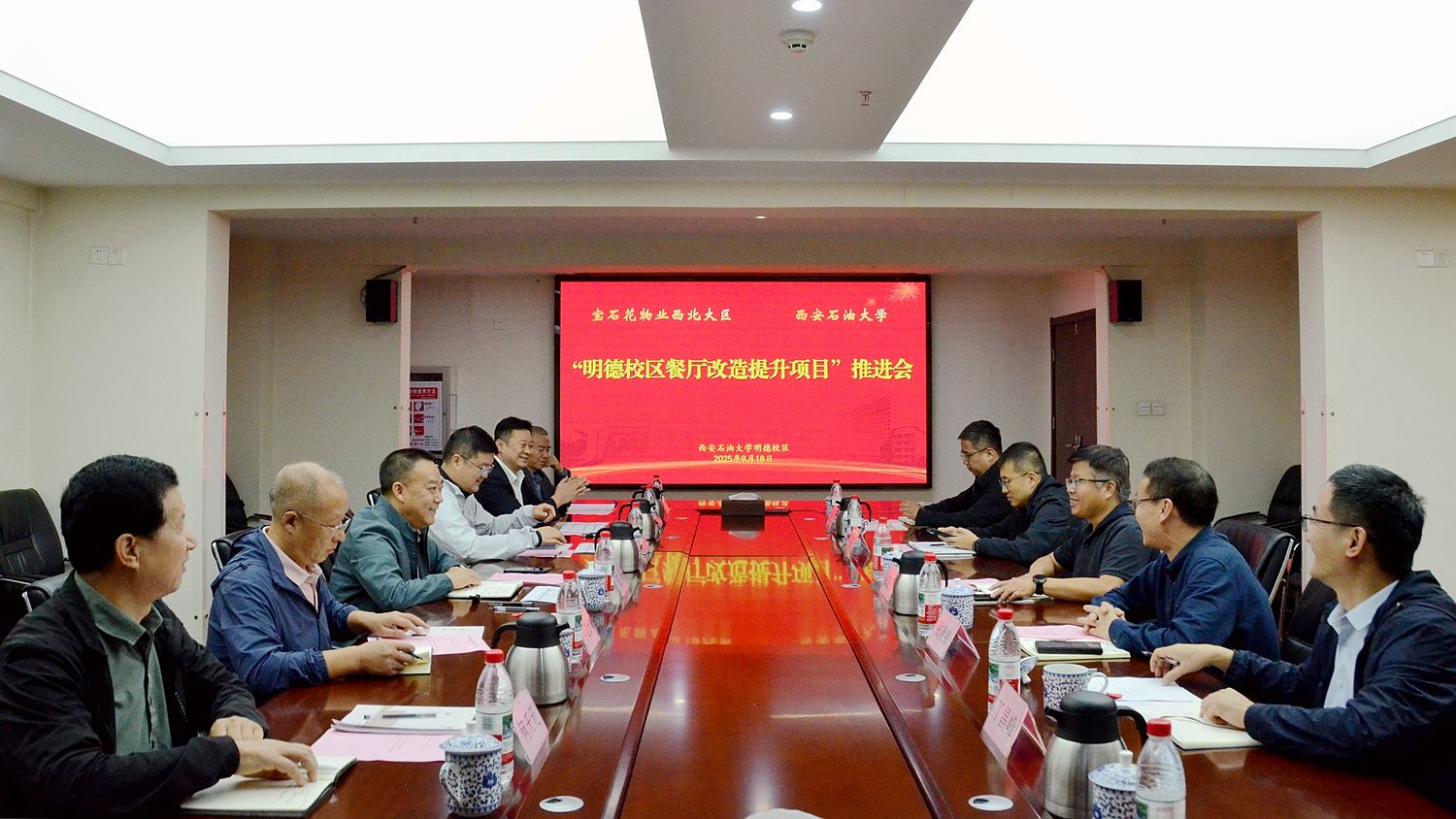 9月18日下午,“明德校區(qū)餐廳改造提升項目”推進會在明德校區(qū)培訓(xùn)中心北樓第一會議室召開。寶石花物業(yè)西北大區(qū)市場總經(jīng)理王泳、副校長張驍勇出席會議,會議由繼續(xù)教育學(xué)院黨總支書記張凌寒主持。寶石花物業(yè)西北大區(qū)、后勤處、國際教育學(xué)院相關(guān)負責(zé)人參會。