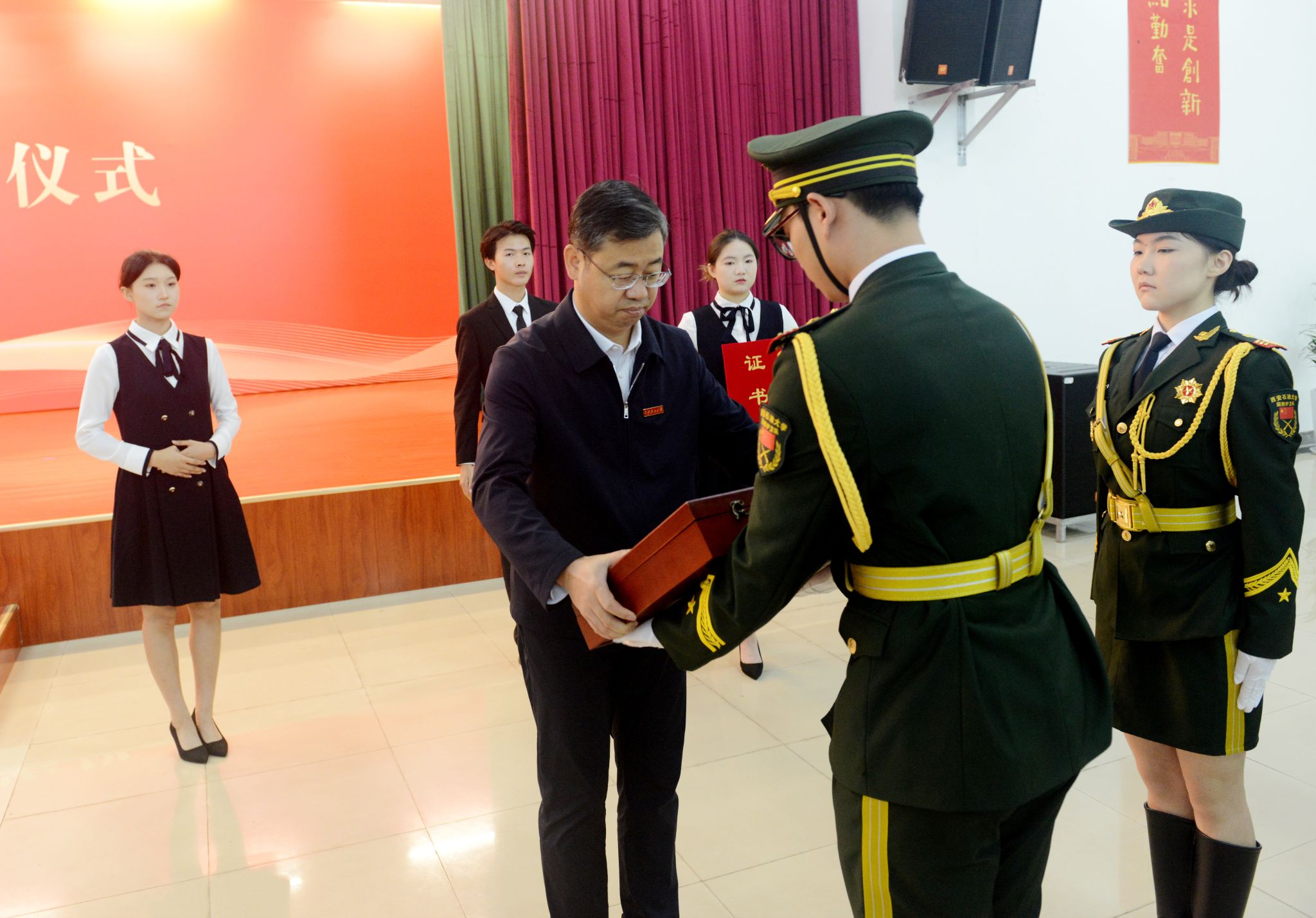上午8時(shí),儀式在莊嚴(yán)的氛圍中正式開(kāi)始。校長(zhǎng)王進(jìn)富將獲贈(zèng)的國(guó)旗及證書(shū)鄭重交予學(xué)校國(guó)旗護(hù)衛(wèi)隊(duì),國(guó)旗護(hù)衛(wèi)隊(duì)隊(duì)員神情肅穆,步伐鏗鏘,莊嚴(yán)地護(hù)送國(guó)旗入場(chǎng)。這面國(guó)旗旗長(zhǎng)5米、寬3.3米,為超大國(guó)旗,整幅旗面無(wú)拼接,五顆星由織造人員手工縫制,工藝特殊,承載著億萬(wàn)中華兒女的深厚愛(ài)國(guó)情懷,也凝聚著我校建校70周年的特別紀(jì)念。