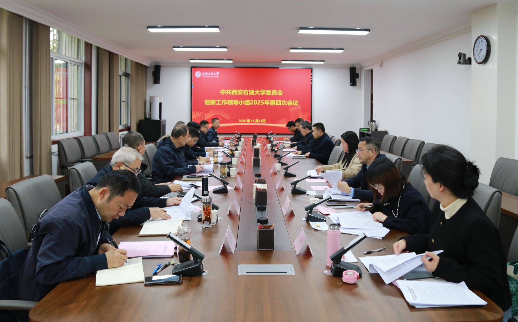 10月21日上午,學(xué)校黨委巡察工作領(lǐng)導(dǎo)小組2025年第四次會(huì)議在鄠邑校區(qū)第三會(huì)議室召開,聽取第三屆黨委第一輪巡察整改工作總體情況匯報(bào)和四個(gè)被巡察院(系)黨組織整改落實(shí)情況匯報(bào)。校黨委副書記、校長王進(jìn)富出席會(huì)議并講話。校黨委副書記、紀(jì)委書記、監(jiān)察專員,校黨委巡察工作領(lǐng)導(dǎo)小組副組長王輝強(qiáng)主持會(huì)議。黨委辦公室、紀(jì)檢監(jiān)察機(jī)構(gòu)、黨委巡察工作辦公室、黨委組織部、黨委宣傳部、黨委統(tǒng)戰(zhàn)部、黨委學(xué)生工作部、黨委教師工作部、黨委保衛(wèi)部、研究生工作部、審計(jì)處主要負(fù)責(zé)人和第一輪巡察四個(gè)被巡察院(系)黨委(黨總支)書記參加會(huì)議。