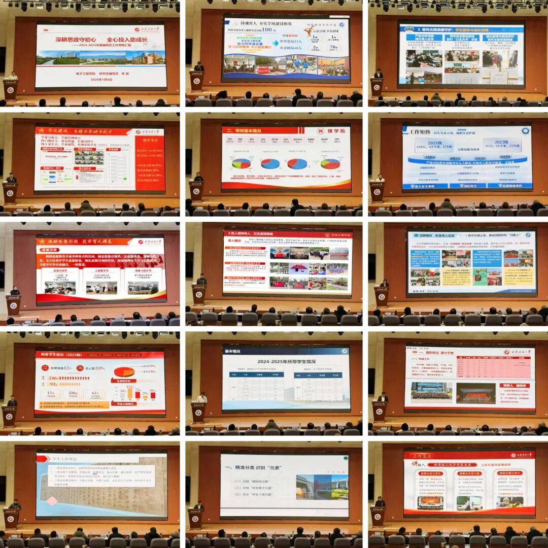 在院(系)匯報環(huán)節(jié),16個院(系)負責人依次登臺,圍繞本學年學生工作核心任務,從思想引領、學風建設、黨團建設、就業(yè)創(chuàng)業(yè)、心理健康、穩(wěn)定安全等關鍵維度,通過翔實數(shù)據(jù)與生動案例,全面總結工作成效,深刻剖析短板不足,并明確下一年度“補短板、創(chuàng)特色、提質效”的具體舉措。多個院(系)黨政負責人結合學科專業(yè)特色補充匯報,充分彰顯了院(系)協(xié)同聯(lián)動推進學生工作的良好格局。