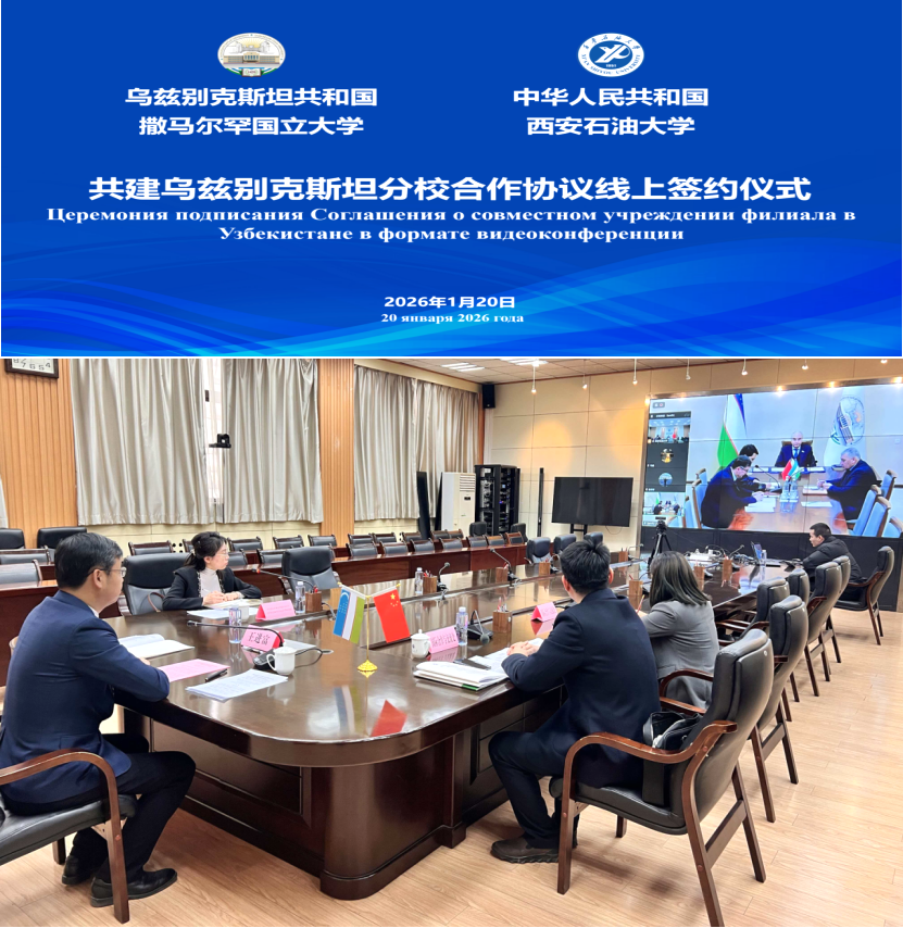 1月20日下午,我校與烏茲別克斯坦撒馬爾罕國(guó)立大學(xué)召開(kāi)共建西安石油大學(xué)烏茲別克斯坦分校合作協(xié)議線上簽約會(huì),會(huì)議在雁塔校區(qū)會(huì)議中心第二會(huì)議室舉行。撒馬爾罕國(guó)立大學(xué)校長(zhǎng)卡爾穆拉多夫·魯斯塔姆·伊布拉齊莫維奇(Халмурадов Рустам Ибрагимович)、副校長(zhǎng)阿克馬爾·阿哈托夫(Акмал Ахатов)、科研副校長(zhǎng)哈基姆·胡什瓦克托夫(Хущвактов Хаким Абдулхакович)等在撒馬爾罕參加線上簽約會(huì)。我校校長(zhǎng)王進(jìn)富出席并代表學(xué)校簽約,副校長(zhǎng)張榮軍線上參會(huì)。國(guó)際合作與交流處處長(zhǎng)、國(guó)際教育學(xué)院院長(zhǎng)董皓主持簽約會(huì)。