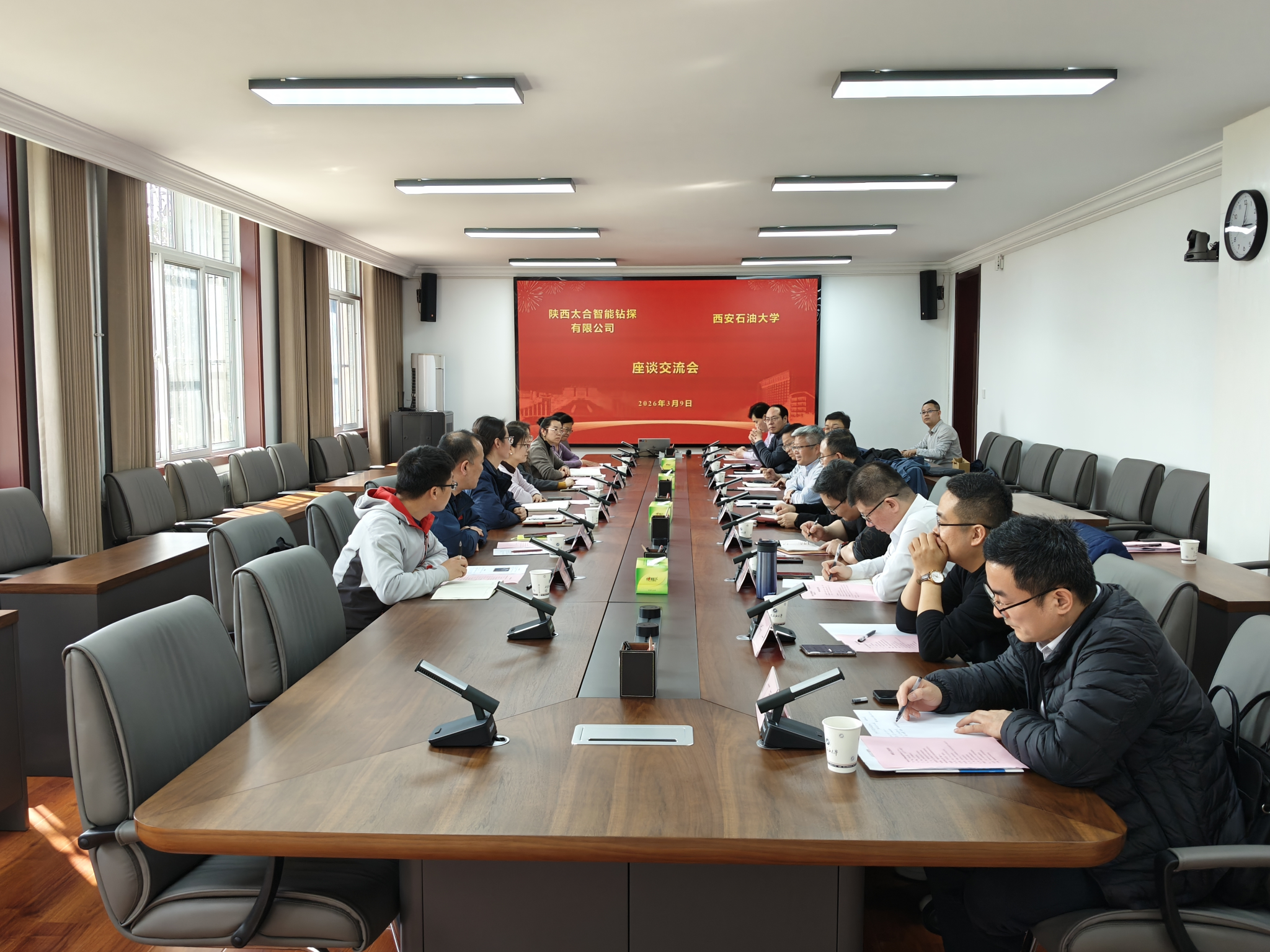 張驍勇代表學(xué)校對李歡一行來訪表示歡迎,對陜西太合智能鉆探有限公司長期以來給予學(xué)校建設(shè)發(fā)展的支持表示感謝,對公司近年來取得的顯著成績給予高度贊賞。他指出,近年來學(xué)校始終堅持開放辦學(xué)理念,緊扣行業(yè)產(chǎn)業(yè)發(fā)展需求,深化產(chǎn)教融合、凝聚辦學(xué)優(yōu)勢、聚焦企業(yè)痛點,圍繞人才培養(yǎng)、科學(xué)研究、社會服務(wù)三大核心職能,與行業(yè)企業(yè)開展全方位、深層次、高水平合作,推動校企協(xié)同發(fā)展走深走實。今年2月14日校企戰(zhàn)略合作協(xié)議的簽署,是雙方立足國家能源安全戰(zhàn)略高度、把握產(chǎn)業(yè)發(fā)展新機遇、順應(yīng)產(chǎn)教融合新趨勢的重要舉措,為后續(xù)深度合作奠定了堅實基礎(chǔ)。他表示,學(xué)校將以此次座談為契機,堅持以合作促發(fā)展、以創(chuàng)新破難題、以實干贏未來,充分發(fā)揮自身學(xué)科特色、科研實力和人才優(yōu)勢,與企業(yè)精準(zhǔn)對接、深度融合、同向發(fā)力、協(xié)同攻堅,全力推動戰(zhàn)略合作協(xié)議各項內(nèi)容落地生根、開花結(jié)果,著力打造產(chǎn)學(xué)研用一體化合作典范,為保障國家能源安全、推動企業(yè)轉(zhuǎn)型升級、助力區(qū)域經(jīng)濟高質(zhì)量發(fā)展貢獻西石大智慧與力量。針對下一步工作,他對學(xué)校相關(guān)部門提出三點要求:一是要將戰(zhàn)略合作內(nèi)容逐項拆解、細化落實,明確工作方案、劃定時間節(jié)點、繪好作戰(zhàn)藍圖,建立常態(tài)化跟蹤推進機制,精準(zhǔn)找準(zhǔn)合作切入點和突破口,確保各項合作任務(wù)有序推進;二是要打破傳統(tǒng)“單兵作戰(zhàn)”模式,轉(zhuǎn)向校企協(xié)同“兵團作戰(zhàn)”,健全常態(tài)化交流對接機制,緊密結(jié)合公司實際需求主動作為,打破學(xué)院、學(xué)科壁壘,扎實開展有組織科研,提升合作實效;三是要推動協(xié)議條款轉(zhuǎn)化為校企利益共同體,積極探索“太合出題、學(xué)校答題”的合作模式,構(gòu)建利益共享、風(fēng)險共擔(dān)的協(xié)同發(fā)展機制,以最大誠意、最實舉措,推動校企合作實現(xiàn)互利共贏、共同發(fā)展。