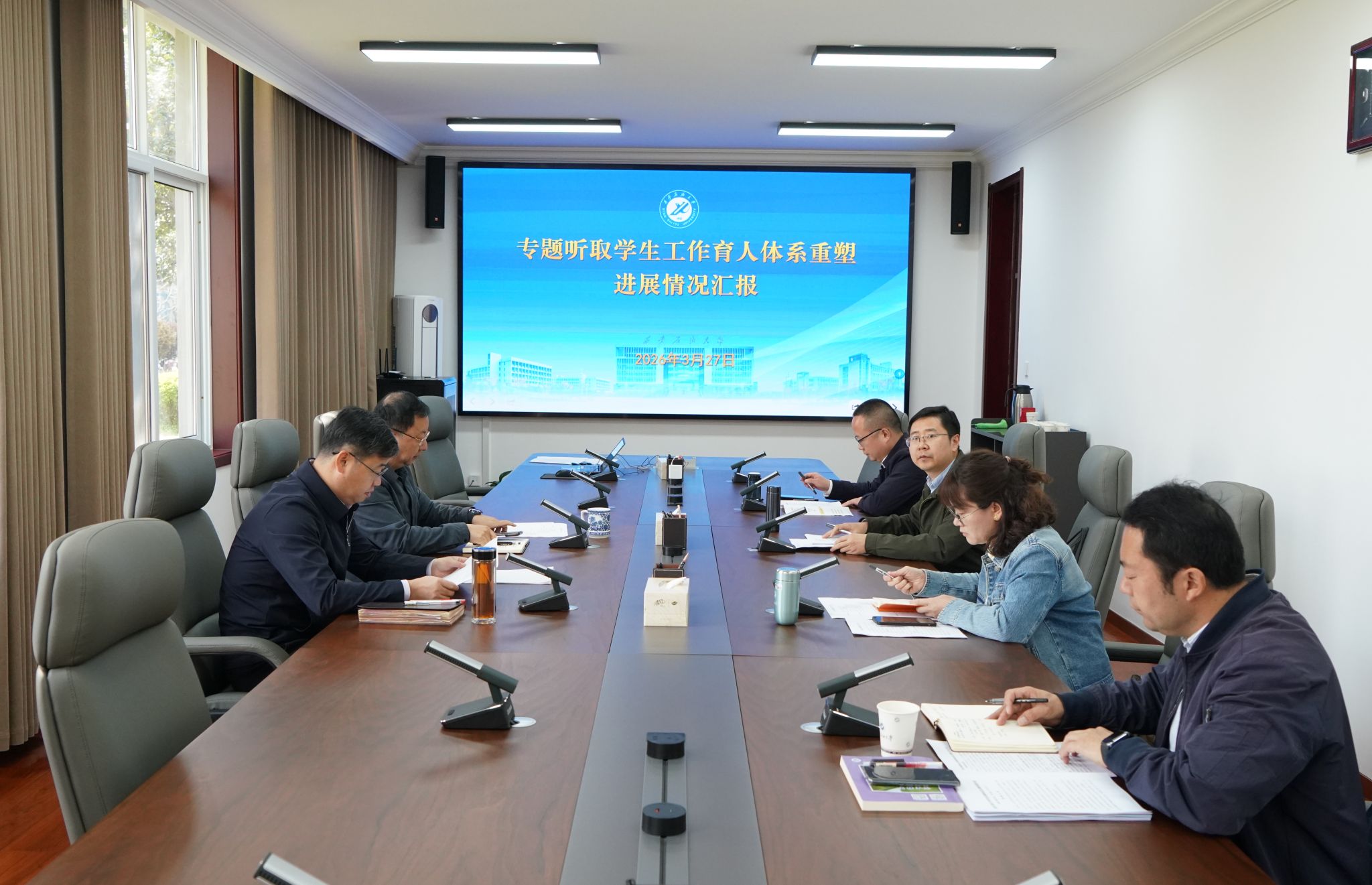 3月27日上午,我校學(xué)生工作育人體系重塑進(jìn)展情況專題匯報(bào)會(huì)在鄠邑校區(qū)第五會(huì)議室召開。校長王進(jìn)富出席會(huì)議并講話,副校長種宇宏主持會(huì)議,學(xué)生工作部、研究生工作部、校團(tuán)委相關(guān)負(fù)責(zé)人參加會(huì)議。