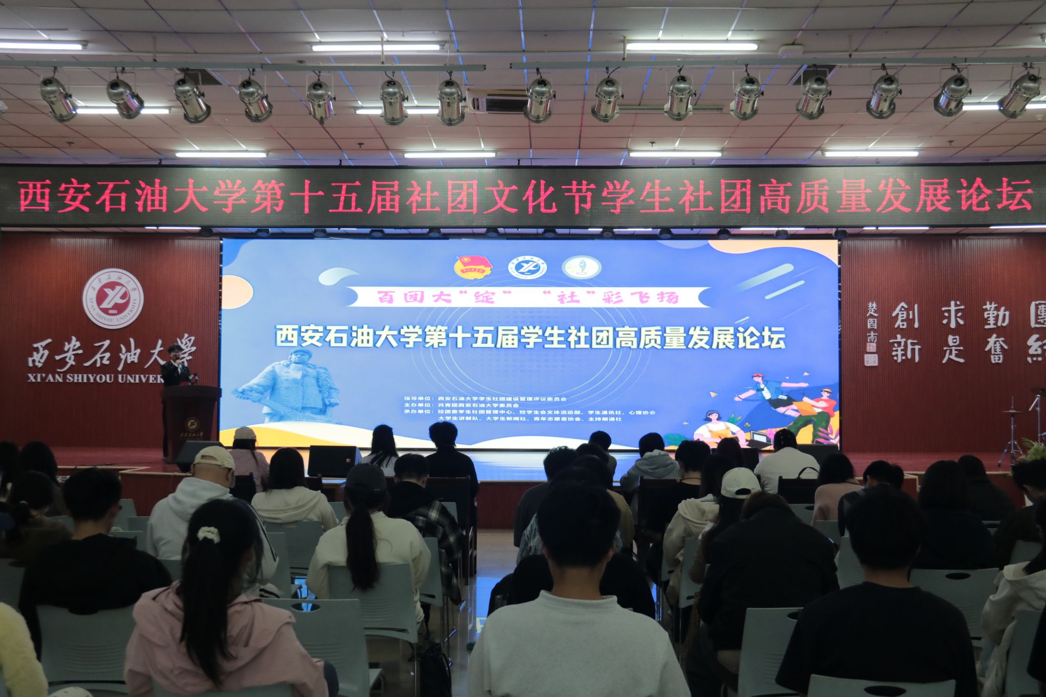 在鄠邑校區(qū)騰輝大學(xué)生活動(dòng)中心舉辦的學(xué)生社團(tuán)高質(zhì)量發(fā)展論壇,校團(tuán)委學(xué)生社團(tuán)管理中心全體成員、學(xué)生社團(tuán)負(fù)責(zé)人及成員代表300余人參加。社團(tuán)管理中心負(fù)責(zé)人總結(jié)了2025年學(xué)生社團(tuán)工作并介紹第十五屆社團(tuán)文化節(jié)活動(dòng)內(nèi)容。西北大學(xué)小黑戲劇工作室,西安建筑科技大學(xué)第二相聲社,我校大學(xué)生講解隊(duì)、青年志愿者協(xié)會(huì)等優(yōu)秀社團(tuán)作社團(tuán)文化建設(shè)與創(chuàng)新發(fā)展理念交流分享。