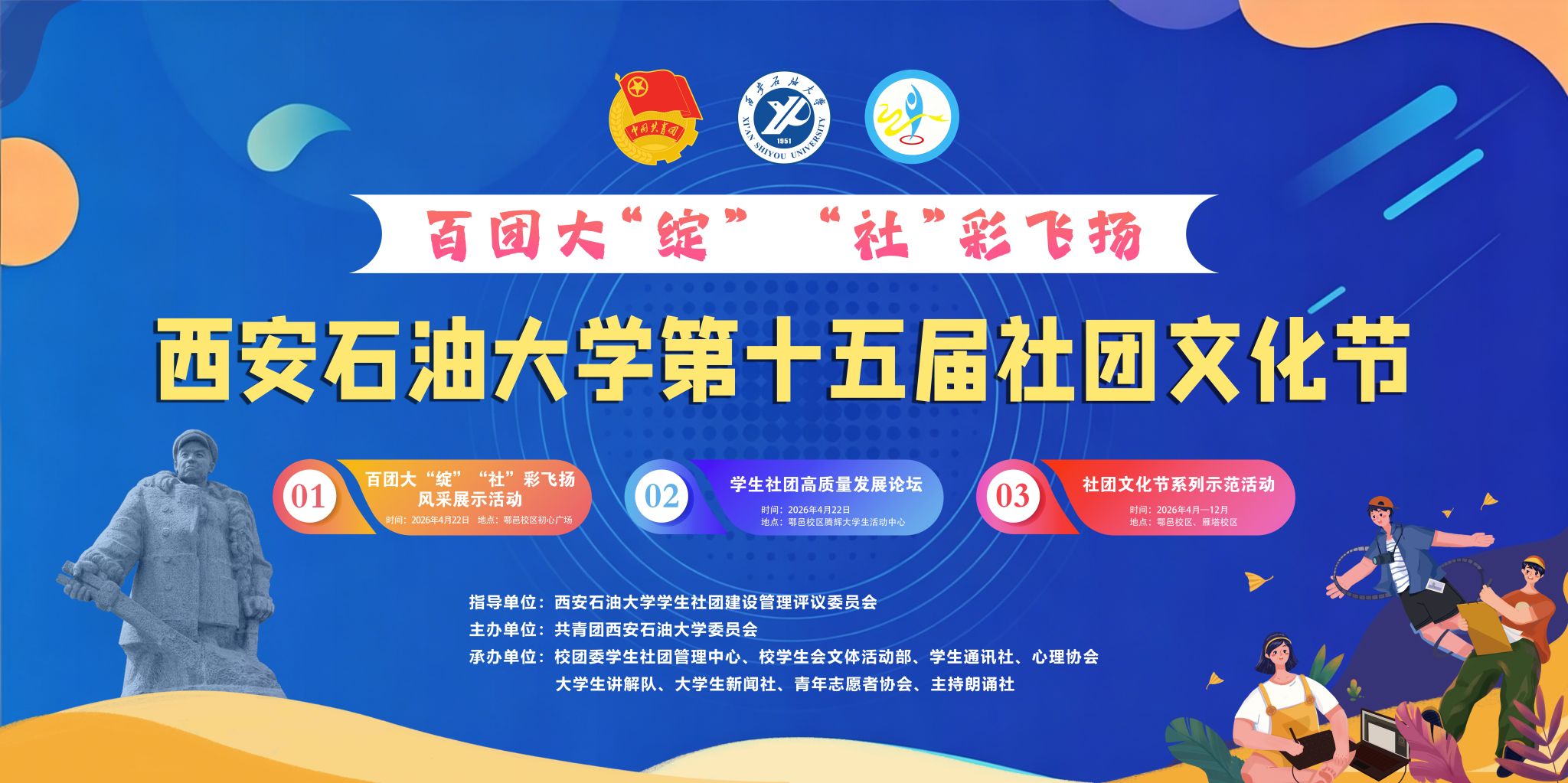 社團(tuán)文化節(jié)作為我?!八墓?jié)兩進(jìn)三會(huì)”校園文化品牌活動(dòng)之一,是學(xué)校積極響應(yīng)團(tuán)中央“校園文化社團(tuán)化”的號(hào)召,持續(xù)開展有內(nèi)涵、有價(jià)值、有意義、有品牌的社團(tuán)活動(dòng),充分發(fā)揮學(xué)生社團(tuán)在人才培養(yǎng)質(zhì)量提升中積極作用的具體體現(xiàn)。本屆社團(tuán)文化節(jié)以“百團(tuán)大‘綻’‘社’彩飛揚(yáng) ”為主題,采用校院聯(lián)動(dòng)、社團(tuán)主辦、分級(jí)承辦模式,圍繞思想引領(lǐng)、文化浸潤(rùn)、能力提升、品牌培育四大主線,重點(diǎn)開展風(fēng)采展示活動(dòng)、學(xué)生社團(tuán)高質(zhì)量發(fā)展論壇、系列示范活動(dòng)三大板塊內(nèi)容。社團(tuán)文化節(jié)將持續(xù)全年,后續(xù)將陸續(xù)推出辯論賽、文藝展演、體育賽事、學(xué)術(shù)沙龍、志愿服務(wù)等一系列沉浸式、高品質(zhì)社團(tuán)示范活動(dòng)。學(xué)校將以社團(tuán)文化節(jié)為抓手,持續(xù)加強(qiáng)社團(tuán)建設(shè)管理,不斷提升社團(tuán)育人實(shí)效,推動(dòng)社團(tuán)活動(dòng)彰顯特色、打造品牌,推動(dòng)創(chuàng)新化、品牌化發(fā)展,為培養(yǎng)擔(dān)當(dāng)民族復(fù)興大任的時(shí)代新人注入源源不斷的青春動(dòng)能。