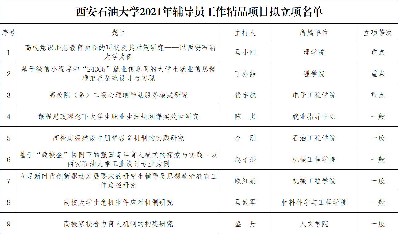 根據(jù)《關于開展2021年輔導員工作精品項目和研究課題申報的通知》(學工函〔2021〕52號)的工作安排,經(jīng)個人申報、所在單位推薦和專家評審,擬對2021年輔導員工作精品項目9項、輔導員工作研究課題15項立項建設?,F(xiàn)將擬立項名單予以公示。