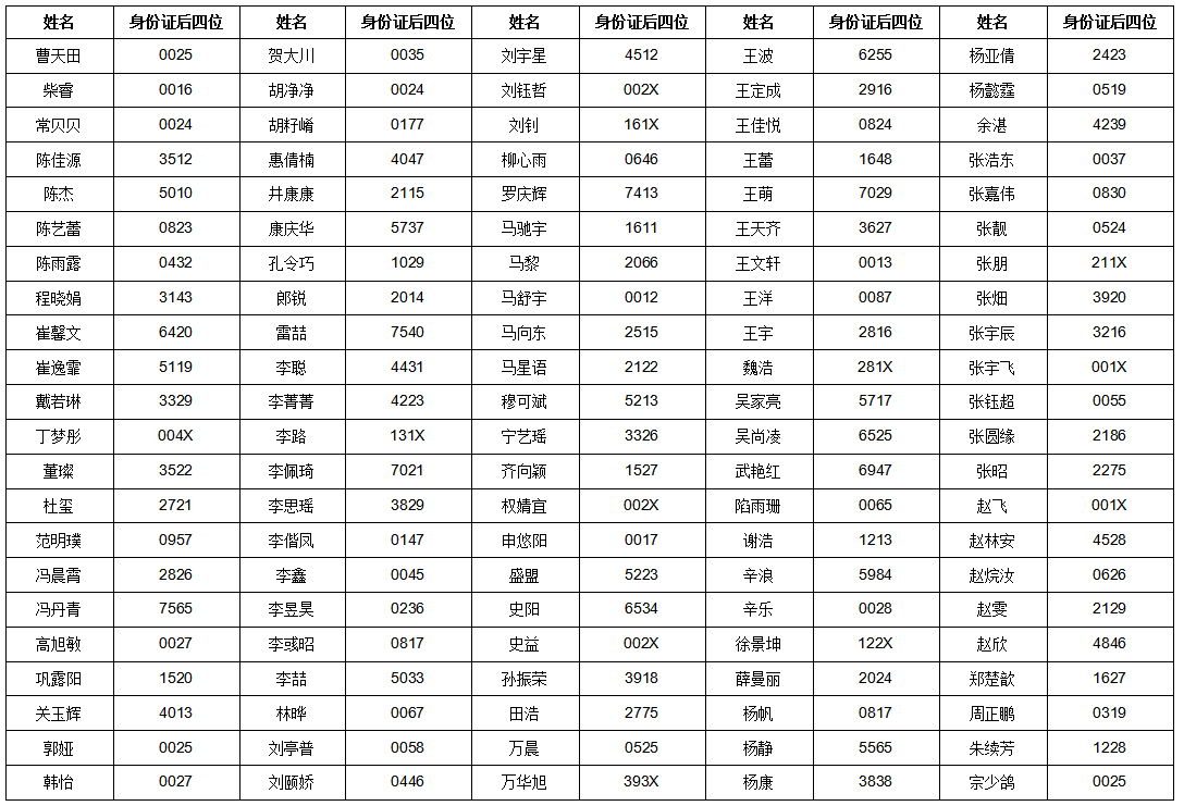經(jīng)學(xué)校人事代理人員招聘統(tǒng)一筆試,以下人員進(jìn)入專(zhuān)業(yè)技能測(cè)試考核環(huán)節(jié),現(xiàn)將人員名單及身份證號(hào)后四位公示如下(按姓氏拼音排序):