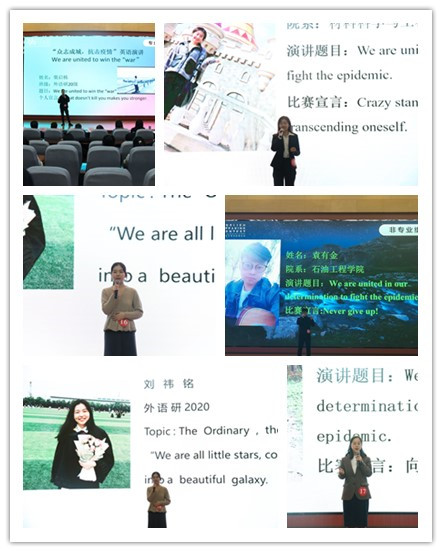決賽當(dāng)晚,選手們從黨中央帶領(lǐng)全國(guó)人民抗擊疫情的決心,白衣天使不畏生死奮戰(zhàn)一線的職業(yè)素養(yǎng),“停課不停學(xué)”的網(wǎng)絡(luò)課堂教學(xué)創(chuàng)新,當(dāng)代青年勇于擔(dān)當(dāng)參與疫情防控等多維度、多角度表現(xiàn)出了對(duì)“眾志成城、抗擊疫情”主題的理解和認(rèn)識(shí)。有的語言流暢、思維敏捷,有的飽含深情、激情闡述,臺(tái)上比賽精彩紛呈,臺(tái)下觀眾掌聲不斷。經(jīng)過近4個(gè)小時(shí)的激烈角逐,最終外國(guó)語學(xué)院韓婷婷、人文學(xué)院曹羽習(xí)榮獲一等獎(jiǎng),外國(guó)語學(xué)院吳芷蕾、人文學(xué)院張晨晨等5名同學(xué)獲二等獎(jiǎng),外國(guó)語學(xué)院劉祎銘、石油工程學(xué)院袁有金等8名同學(xué)獲三等獎(jiǎng),經(jīng)濟(jì)管理學(xué)院黃海云等6名同學(xué)獲得優(yōu)秀獎(jiǎng)。