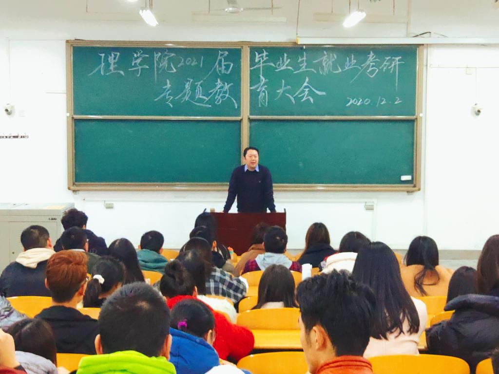 12月2日下午,理學院在鄠邑校區(qū)B214教室舉辦本學期第四次畢業(yè)生就業(yè)考研專題教育大會,學院黨委副書記馬小剛主講,學生管理辦公室主任丁亦喆主持,2017級全體本科生參會。