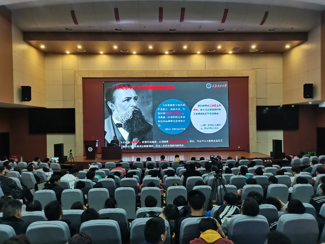 本次講座主要有兩部分,即馬克思主義哲學在現(xiàn)當代社會中的價值及其與如何指導當代大學生活。石少虎老師首先拋出兩個問題,即“何為哲學”和“哲學又為何”,又以幽默風趣的語言講述了季羨林先生的故事和“三人行必有我?guī)煛钡睦?,給出自己的解答——哲學是萬物的本源,是智慧,是樂趣。通過問題和事例引發(fā)大家的思考,進而引入本次講座的第一個主題——馬克思主義哲學,石老師向同學們介紹了三個方面的內(nèi)容:馬克思主義當代價值的理論挑戰(zhàn)、馬克思主義的理論闡釋、堅定馬克思主義的理論自信,通過對上述論點深入淺出地精彩講解,使得同學們對馬克思主義哲學當代價值的認識更加明晰。隨后,石老師引入“馬克思主義哲學與大學生活”這一核心觀點,他認為,大學的生活與責任即是要學會辯證地看待問題、要敢于人先大膽創(chuàng)新。在介紹完馬克思主義哲學與大學的聯(lián)系之后,石老師用同學們樂于接受的語言方式講述了歷史上的名人事例,并對比古今中外思想成果,探尋了人類思想發(fā)展的脈絡(luò),更新了同學們對馬克思主義思想的高度,更是讓同學們對于馬克思主義在未來中國發(fā)展產(chǎn)生了更美好的憧憬與強烈的自信。