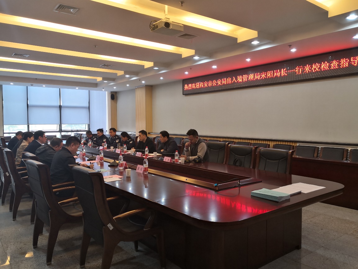 11月11日下午,西安市公安局出入境管理局局長(zhǎng)宋陽(yáng)等來(lái)我校鄠邑校區(qū)就留學(xué)生簽證及留學(xué)生日常管理等工作進(jìn)行調(diào)研和督查,調(diào)研座談會(huì)在鄠邑校區(qū)圖書(shū)館第二會(huì)議室舉行。市公安局出入境管理局外管一科、鄠邑分局外事警官,我校鄠邑校區(qū)管理辦公室、保衛(wèi)處、國(guó)際教育學(xué)院等部門(mén)有關(guān)人員參加調(diào)研和座談。