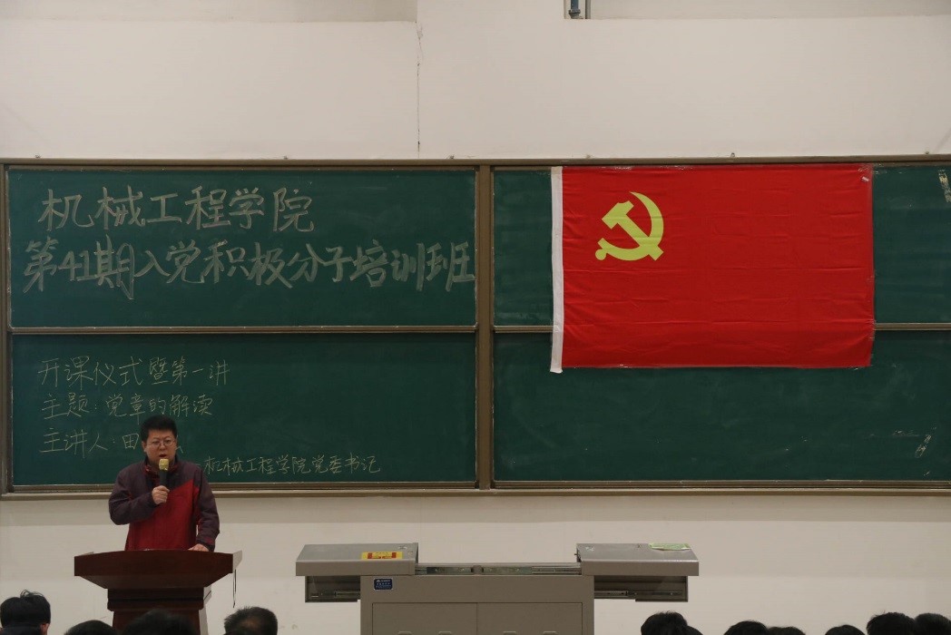 為提高我院入黨積極分子的黨性修養(yǎng),嚴(yán)肅黨的組織生活制度,提升積極分子學(xué)習(xí)的主動積極性,根據(jù)學(xué)院黨委的統(tǒng)一安排, 10月29日晚,機(jī)械工程學(xué)院在鄠邑校區(qū)石工地科樓115教室舉行第41期入黨積極分子培訓(xùn)班開班儀式暨第一次集中授課。機(jī)械工程學(xué)院黨委書記田黨宏為全體入黨積極分子授課,團(tuán)委學(xué)生會指導(dǎo)老師邱迪參加并宣讀黨課紀(jì)律與要求,開班儀式由院團(tuán)委書記文愛國主持。