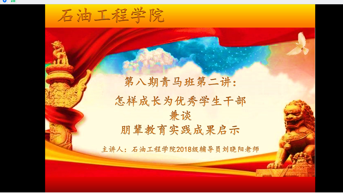 為了加強學生干部個人能力素質(zhì)培養(yǎng),推進朋輩教育實踐建設(shè),我院于5月19日晚開展了石油工程學院第八期青馬班第二講,我院2018級輔導員劉曉陽老師為參訓學員講授了題為“怎樣成長為優(yōu)秀學生干部兼談朋輩教育實踐成果啟示”的培訓。本次活動采取網(wǎng)絡(luò)授課的形式,收獲了良好了效果。