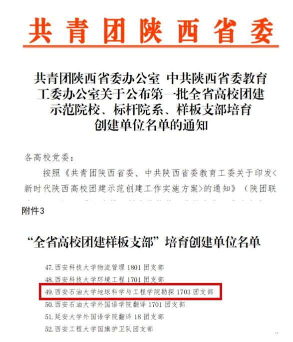 近日,經(jīng)校團(tuán)委推薦,共青團(tuán)陜西省委辦公室、中共陜西省委教育工委辦公室聯(lián)合公布了“第一批全省高校示范院校、標(biāo)桿院系、樣板支部培育創(chuàng)建單位名單”。地球科學(xué)與工程學(xué)院勘探1703團(tuán)支部獲批“陜西省高校團(tuán)建樣板團(tuán)支部”培育創(chuàng)建單位。