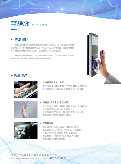 陜西利豐恒信生物科技發(fā)展有限公司成立于2017年,是西北地區(qū)最早擁有掌靜脈識別技術,并成功推廣到行業(yè)應用的科技創(chuàng)新型單位。公司地址位于西安市高新區(qū),擁有包括掌靜脈識別、指靜脈識別、人臉識別、指紋識別等國內外先進的識別專業(yè)技術。公司致力于先進的生物識別技術的集成、開發(fā)和應用,為不同行業(yè)不同需求的客戶提供整體解決方案,尤其在司法公安系統(tǒng)中結合實際管理情況和應用需求,不斷完善、創(chuàng)新推出具體可行的解決方案,得到各合作單位的一致好評。目前公司業(yè)務遍及陜西、四川、廣東、海南、廣西等省市。