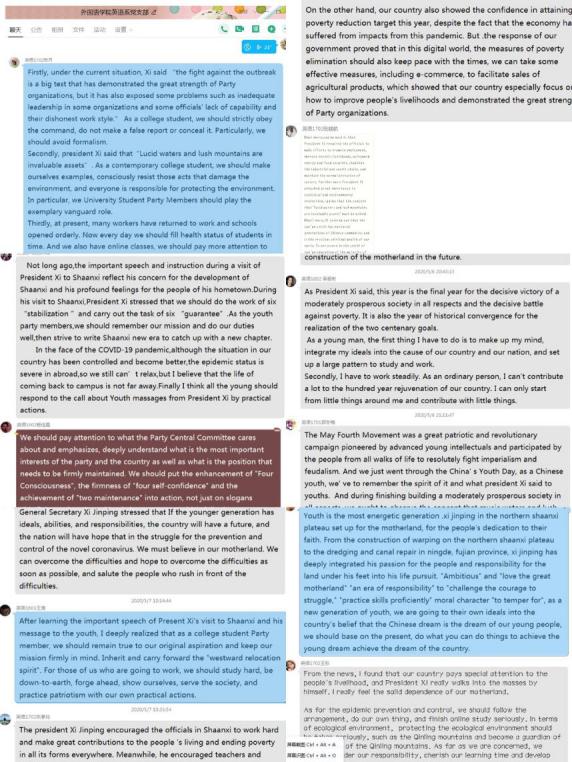 2017級黨員齊澤芃說:“President Xi came to Shaanxi province to instruct officials to overcome the impact of the novel corona virus outbreak and fulfill this year's poverty eradication goal during an inspection tour, actually I have lots of words and feelings after what China and the world have gone through or have been going through until now, I really think we Chinese people are the most disciplined nation in the world, which helped us overcome the epidemic quickly. Compared to other countries, we can see they are still in a complete mess, and many countries turn to China.”