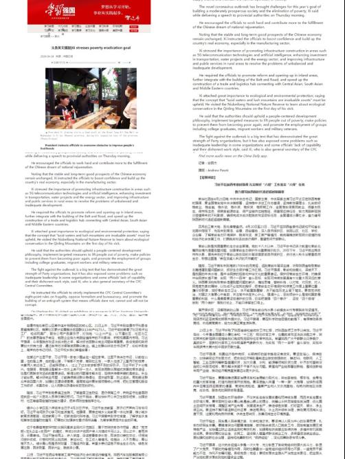 專題學習會上,通過原文學習新華社《習近平在陜西考察時強調(diào) 扎實做好“六穩(wěn)”工作落實“六?!比蝿?wù) 奮力譜寫陜西新時代追趕超越新篇章》,認真學習習近平總書記來陜考察重要講話重要指示精神,深刻學習領(lǐng)會習近平總書記關(guān)于新冠肺炎疫情常態(tài)化防控工作的重要講話和指示精神。通過《China Daily》頭條播報中《Xi stresses poverty eradication goal》一文和習近平總書記五四青年節(jié)對廣大青年的寄語雙語學習資料內(nèi)容進行重點學習,張帆老師還對習近平總書記來陜視察講話重要指示精神中的重點部分進行中英對照講解。