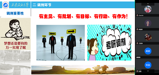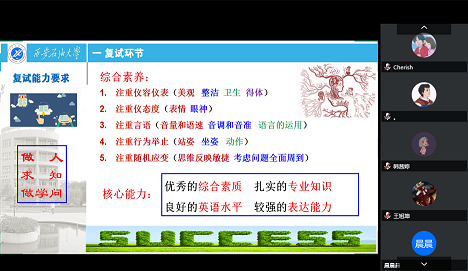 畢業(yè)班輔導(dǎo)員宋二鵬老師也對(duì)同學(xué)們備戰(zhàn)研究生復(fù)試過程中的注意事項(xiàng)進(jìn)行了提醒和建議,同時(shí)對(duì)準(zhǔn)備復(fù)試期間大家所需要的各種材料寄送工作做了說明。